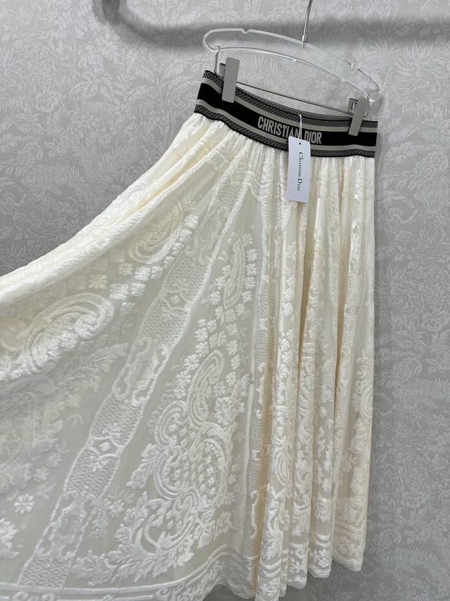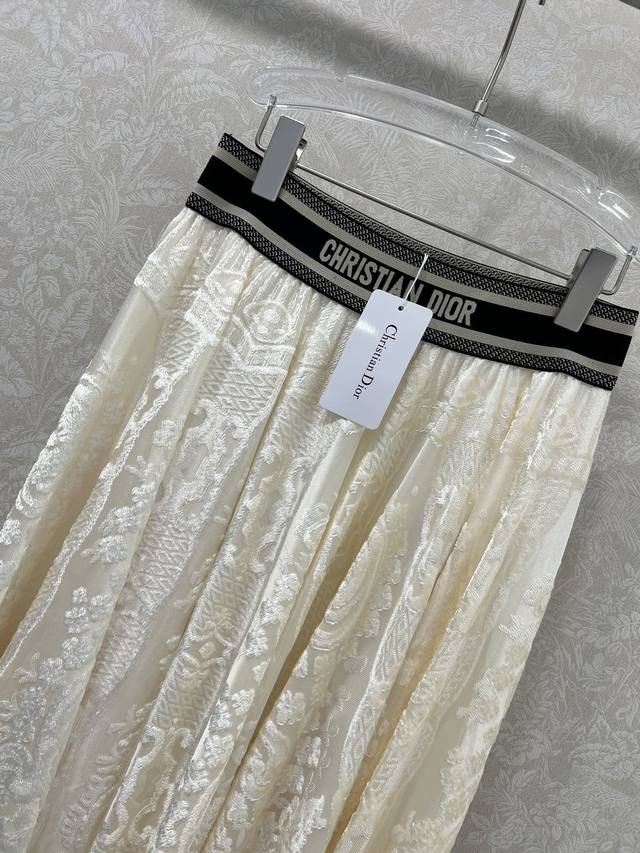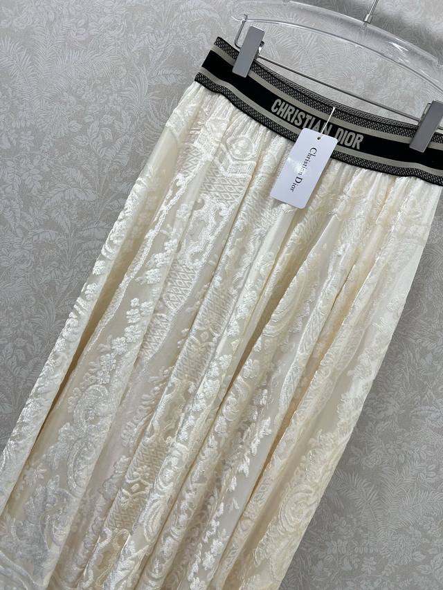 Dio*25 New Ribbon Lace Midi Skirt, Custom Made with Imported Lace Flocked Material, Textured and Lustrous, Comfortable and Skin-Friendly. The signature letter ribbon at the waist adds a decorative touch, showcasing the brand's style. The entire skirt is adorned with lace fabric and flocked embroidery, complemented by an outward-flaring umbrella-shaped pleated hem. This design successfully slims the figure, conceals the hips, and flatters the legs. The relaxed fit adds a sense of style and dimension. The high-waisted, mid-length midi skirt is versatile and easy to match. 3 Colors, 4 Sizes: S, M, L, X, D, D