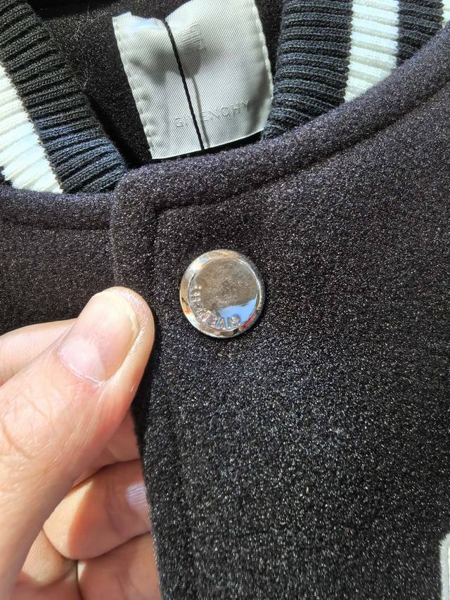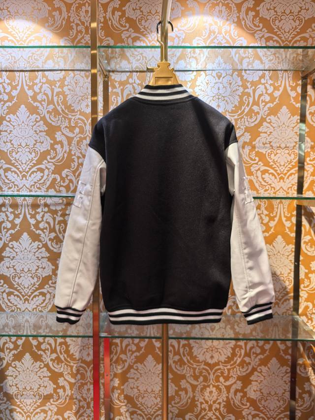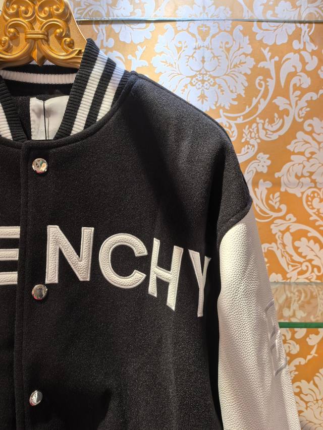 Givenchy 2025 Fall/Winter High Street Collection Letter Embroidered Baseball Jacket. The front features white 3D embroidery of the "Givenchy" brand name, while the sleeves are adorned with the brand's iconic 4G logo embroidery. The collar, cuffs, and hem feature a black and white contrasting ribbed design, giving it a classic retro feel. The main body is made of a wool blend fabric, offering excellent structure and warmth. The sleeves are made of white grained leather, with a delicate texture and a high-end feel, while the 4G logo is embroidered to enhance brand recognition. This Givenchy high street collection item blends the casual feel of American baseball jackets with the iconic design of a luxury brand, representing a typical example of the "affordable luxury streetwear" trend in recent years, perfect for creating an eye-catching and trendy look. Color: Black. Sizes: M-XL.