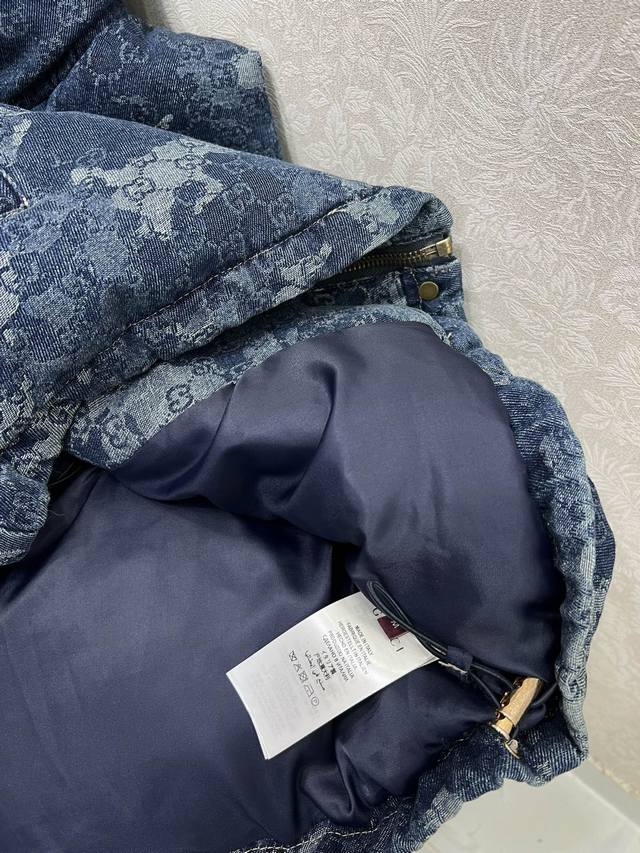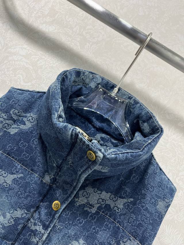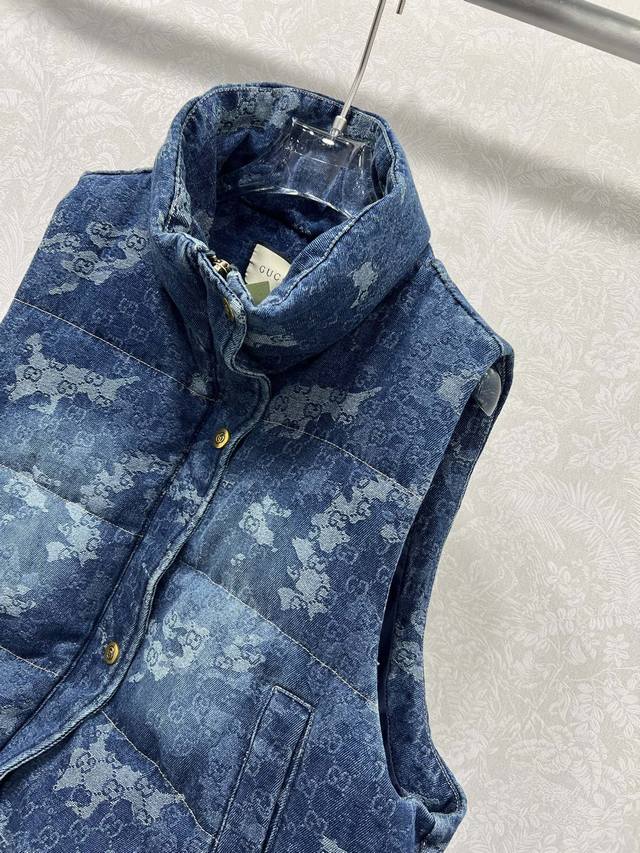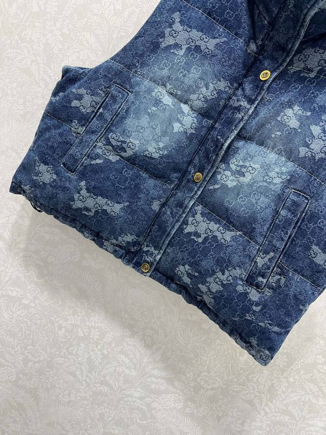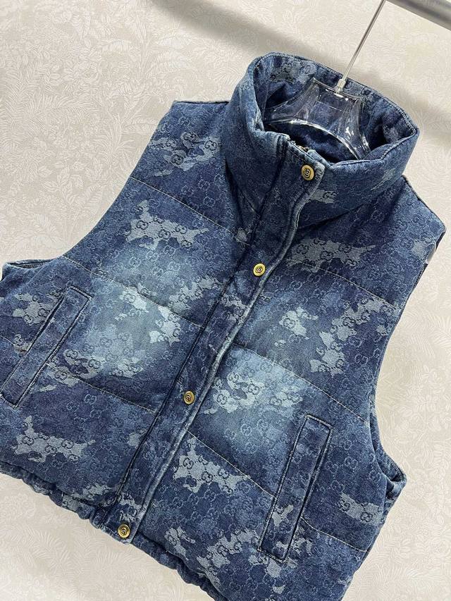 Gucc*25 New Denim Down Vest, 90% White Duck Down, Denim Series, Stand Collar, Gradient Dye Denim Fabric, Custom Hardware Creates Visual Layers, Creates a Neat and Stylish Look with a Retro Chic. Attention to detail, warm, structured, and comfortable. Classic and flattering fit, incredibly slimming! A must-have for sophisticated women. Single color, sizes S, M, L, D, D.