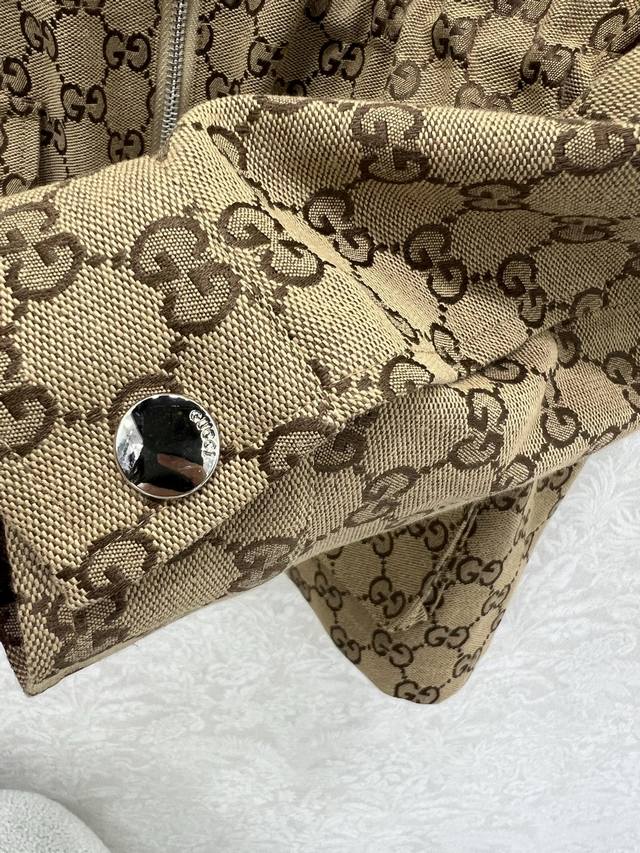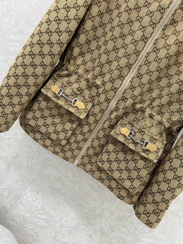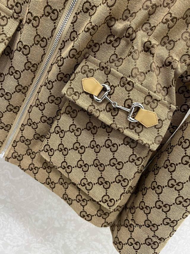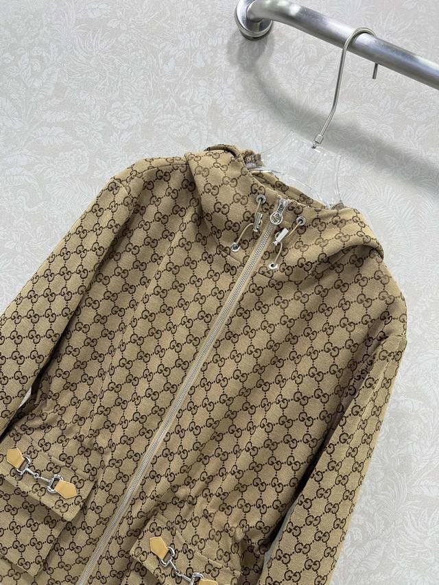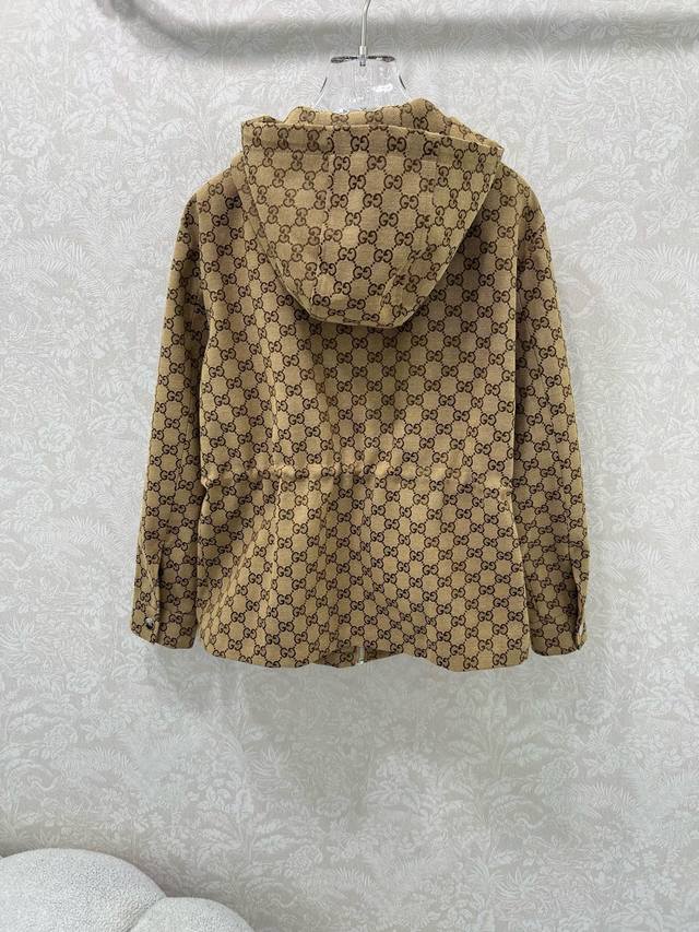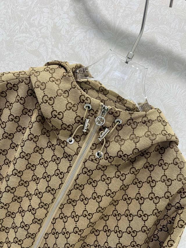 Gucc*25 New Hooded Jacquard Jacket. The double G jacquard fabric creates a strong visual impact and a high level of style. It easily showcases youthful personality. The drawstring waist allows for adjustment, preventing a dated look. It's stylish, windproof, and waterproof, reflecting a high-end design concept. Clearly engraved metal hardware and a large pocket with a horsebit detail add to the overall appeal. High-quality fit and excellent fit! Available in 2 colors and 3 sizes: S, M, L, D, D.