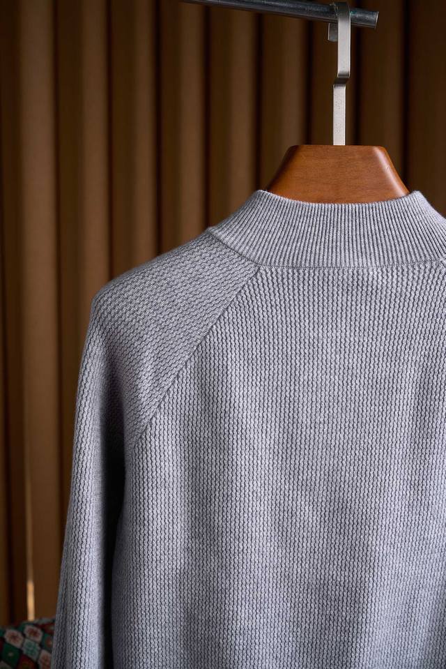 Leather Half-Zip Knit Sweater, made with 34.6% wool jacquard rib knit, raglan sleeves, and stand-up collar. A new style with improved texture and warmth. Made with 34.6% wool, this men's half-zip stand-up collar knit sweater is soft and delicate to the touch, gentle on the skin, and helps retain warmth, perfect for cool mornings and evenings. The jacquard rib knit creates a clear and three-dimensional texture, breaking away from the monotony of basic styles and showcasing quality in the details. The raglan sleeves are flattering for all shoulder types, allowing for free movement. The stand-up collar provides wind protection and neck support, while also highlighting the neckline. The half-zip design is highly practical, allowing for adjustable neckline opening. It looks sharp on its own or layered under a shirt for added style. Suitable for everyday commuting, casual outings, and effortlessly stylish looks. Sizes: M-3XL