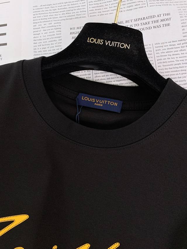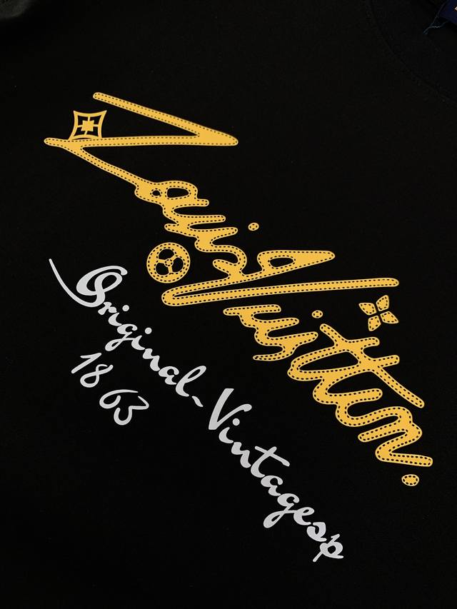 Louis Vuitton 2025 Spring/Summer New Arrival - Embossed Logo T-Shirt. A creative presentation of the iconic element. The prominent logo on the chest features a smooth and artistic handwritten font in a striking gold color, embellished with the classic Monogram pattern, making the brand logo anything but monotonous. Below, the words "Original-Vintageso 0" in an elegant handwritten font echo the brand logo above, commemorating the brand's rich history since 1863. Made from high-quality pure cotton, the T-shirt is soft and skin-friendly, breathable and sweat-wicking, ensuring the wearer's comfort at all times. The neckline, cuffs, and hem feature meticulous stitching with fine and even stitches, ensuring durability and adding to the overall sophistication . Size: M-3XL