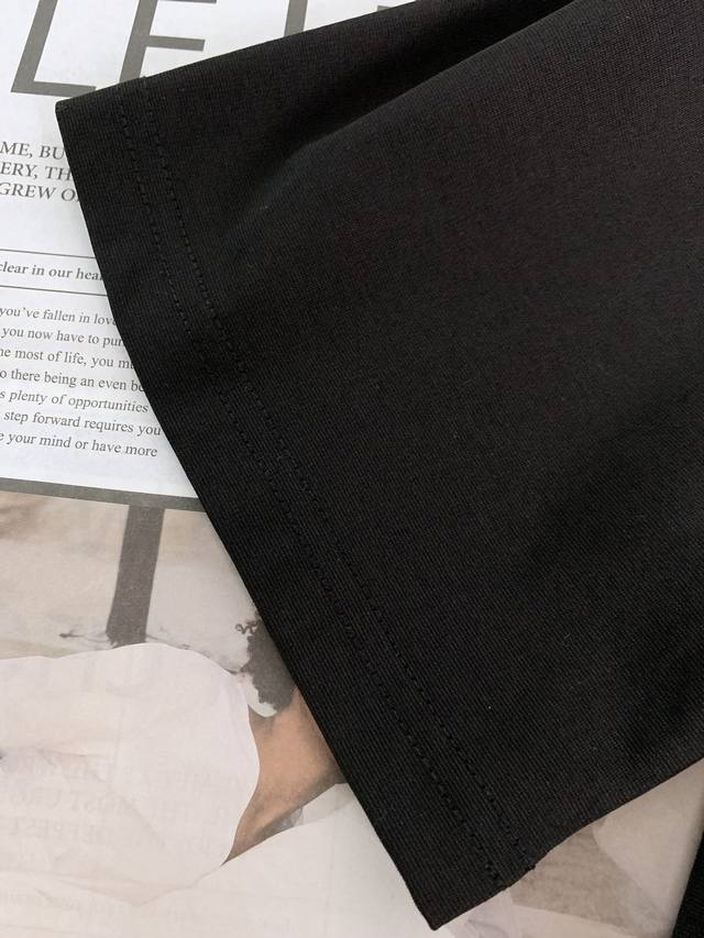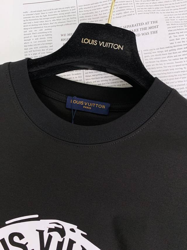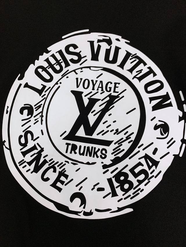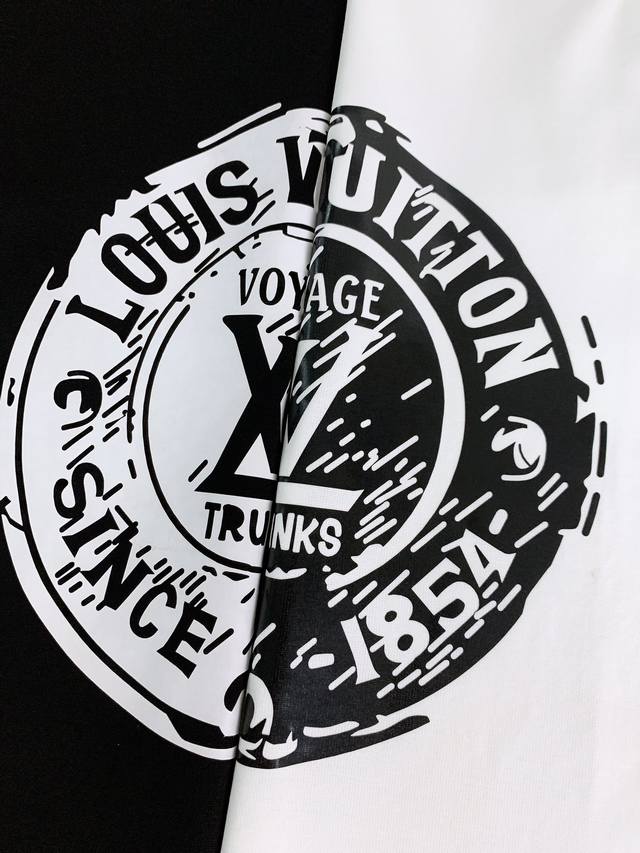 Louis Vuitton 2025 Spring/Summer New Arrival - Vintage Badge Print T-Shirt. The circular print on the front is an epitome of LV's travel spirit. The outer ring, "Louis Vuitton* Since 1854," commemorates the brand's history, while the inner ring, "Voyage Trunks," echoes the brand's origins in travel trunks, adding a touch of casual relaxation to the classic design. It's like transferring the marks from antique trunks directly onto the garment, making it both retro and vibrant. Made of pure cotton, it's soft and durable to the touch, breathable and comfortable against the skin, and doesn't easily deform after washing, perfectly balancing comfort and durability. The tightly ribbed neckline ensures it won't loosen even after long wear. The print ink is delicate, with clean edges on the white pattern contrasting sharply with the black fabric, showcasing quality in every stitch. The loose, relaxed fit and dropped shoulders minimize any sense of constraint, making it easy to style alone or layered for a sophisticated look. From a trunk maker in 1854 to a fashion icon today,