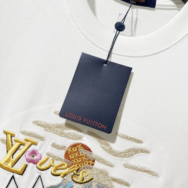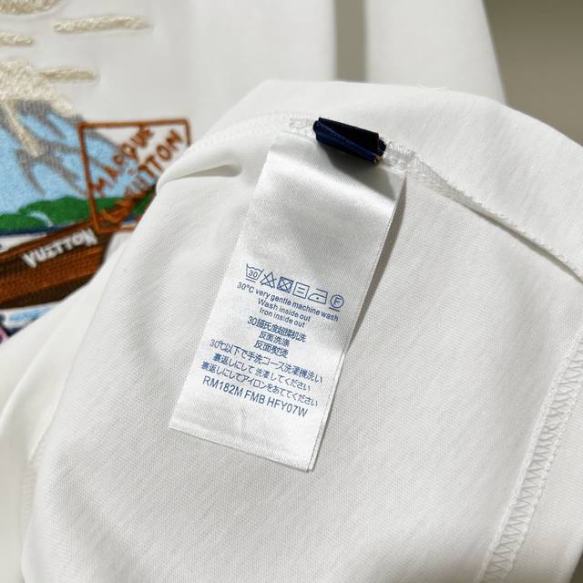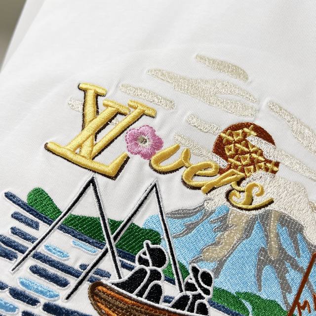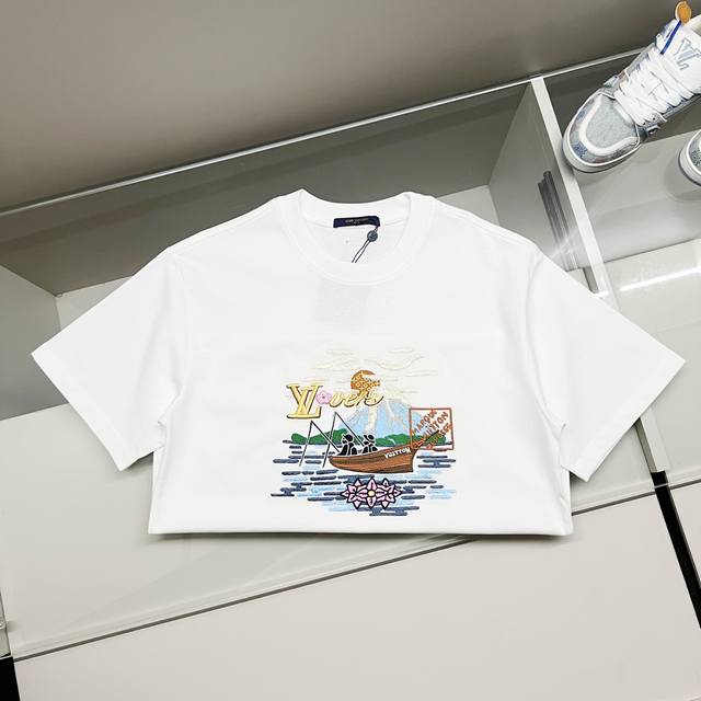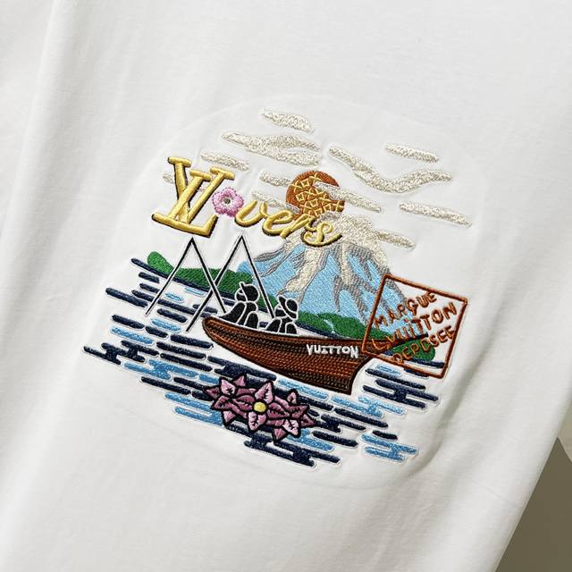 Louis Vuitton 300g Crew Neck Short Sleeve T-Shirt, Collaboration with Sailing, Fishing, Landscape, Letter Logo Embroidery, Official 1:1 Original Mold, Stylish, Versatile, Trendy, Pure Original Quality, Original Washed Fabric, Complete with Hangtag, Neck Label, Washing Label, and Three Tags, Colors: Black, White, Sizes: S-XL
