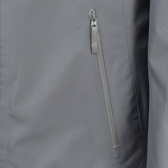 features traditional accordion-style reverse entry mountaineering pockets positioned high up, a Vislon center front zipper, adjustable Velcro cuffs with Velcro tags, zip-in compatibility, and an Arc Teryx logo embroidered on the chest using a Behringer machine.