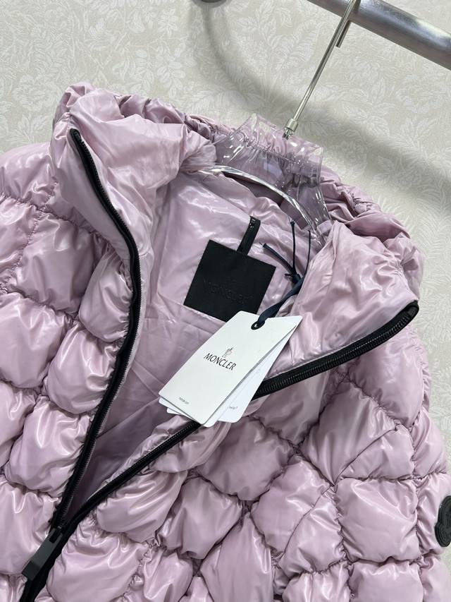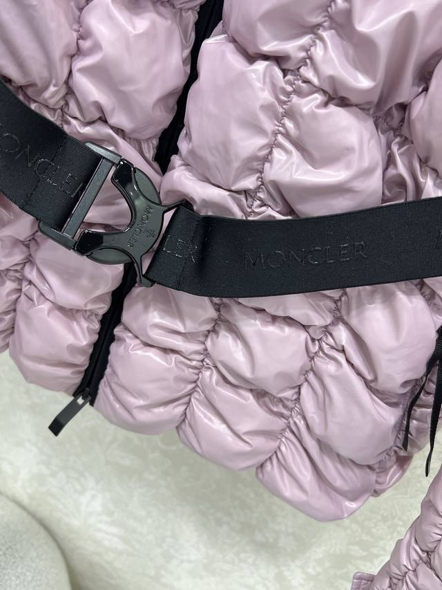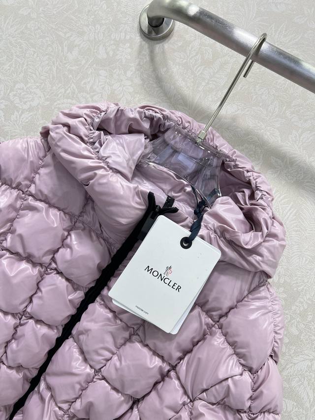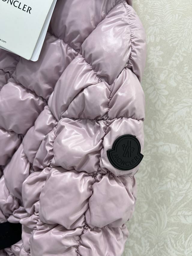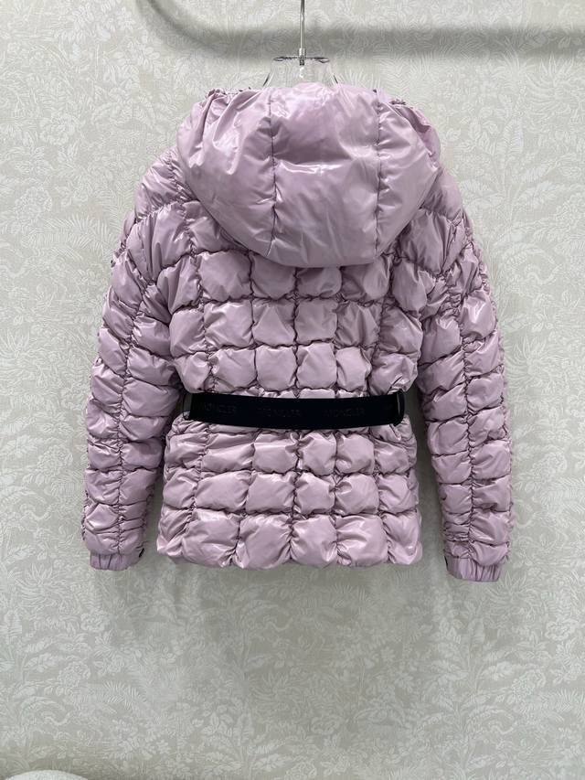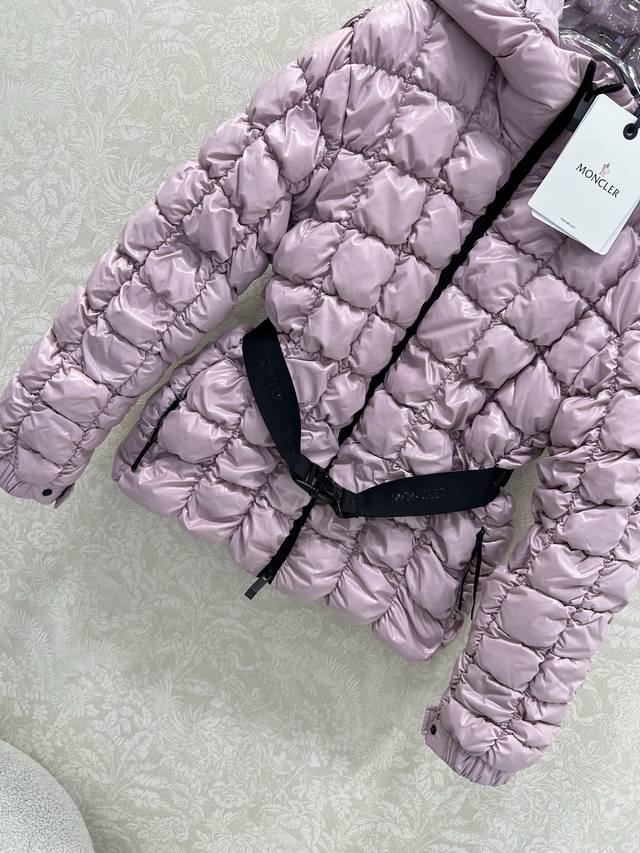 Moncle*25 Autumn/Winter New Sweet and Cool Girl Glossy Functional Black Diamond Quilted Hooded Down Jacket. A perfect blend of sweet and cool! Made with a lightweight and warm down core, the diamond quilting locks in warmth without adding bulk. The soft matte pink base color paired with black functional elements creates a perfect collision of girlish charm and street style. Warm and slimming! A detachable wide belt instantly defines the waistline; large-capacity pockets are both practical and stylish, perfect for layering in winter. The front features a smooth, water-repellent zipper, and a black brand logo on the left chest enhances brand recognition; the lining is made of skin-friendly fabric, ensuring a lightweight and comfortable feel even in sub-zero temperatures. Versatile. Pair it with a soft and youthful look, or with a playful and casual style. Wear the belt to create a taller silhouette, or unbuckle it for a relaxed and effortless winter look. A must-have for sweet girls this winter! Quality craftsmanship is evident in the details. Available in two colors and sizes 0, 1, and 2.