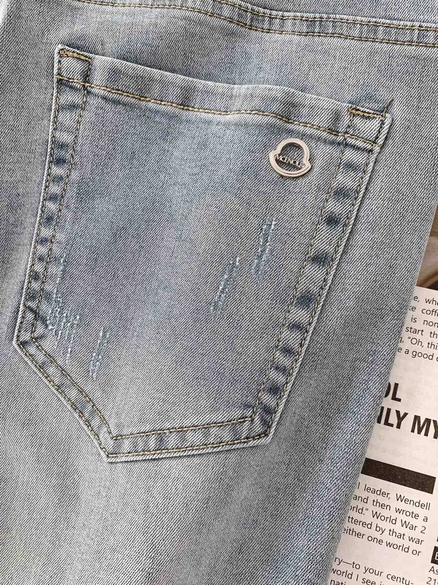 Moncler 2025 Spring/Summer New Arrival: High-fashion casual washed denim jeans. The fabric is special, a blend of ultra-fine imitation cotton yarn, offering exceptional softness and comfort. It combines the casual, relaxed, and stylish feel of denim. The fabric is crisp, slightly stretchy, and ultra-soft for extended wear. The entire pair of jeans undergoes traditional hand-washing and natural stone-washing. The fit is a fitted, slightly straight leg cut with exquisite details. Size: 28-38