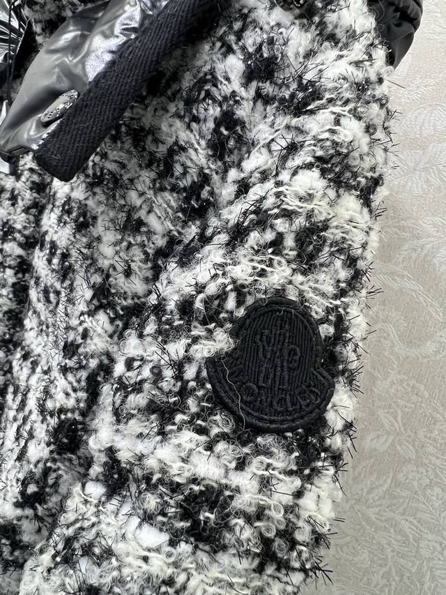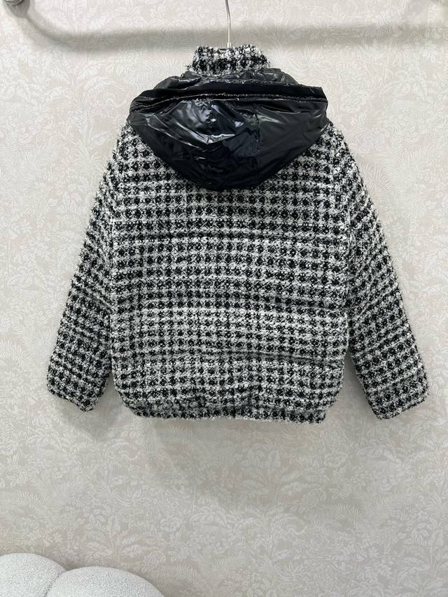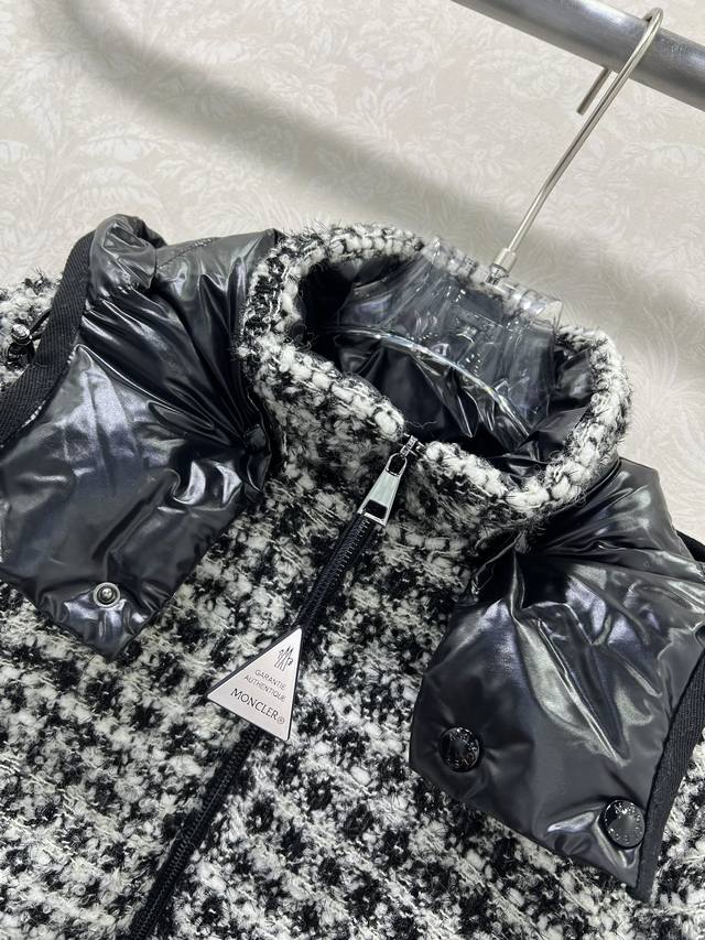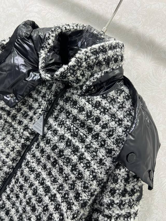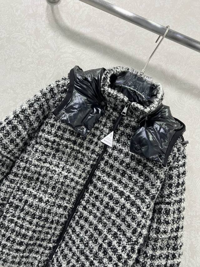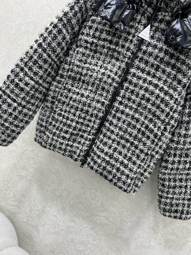 Mon*Ler 25Fw Autumn/Winter New Andronne Silky Check Chanel-Knit Down Jacket | Exclusive Yb Development! High-Quality Production! Featuring a red and white, or black and white silky check Chanel-knit fabric, filled with high-loft down, it's warm and luxurious for autumn and winter. The sleek, short silhouette is flattering for all body types, exuding French elegance and refined texture; it features the brand's signature glossy down shoulder panels and a detachable hood, perfectly suited for both elegant evening wear and sophisticated urban commutes, allowing you to seamlessly switch between warmth and style. Available in 2 colors and 3 sizes (0, 1, 2,