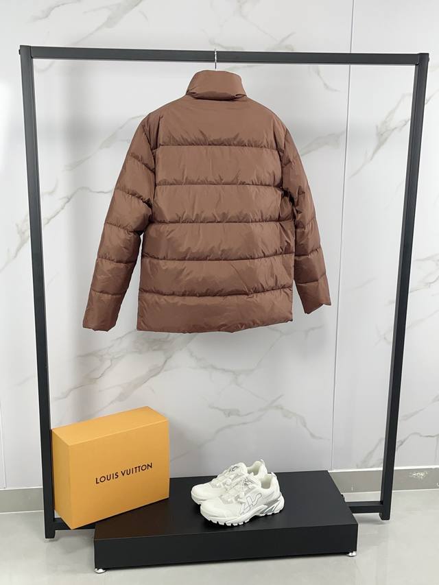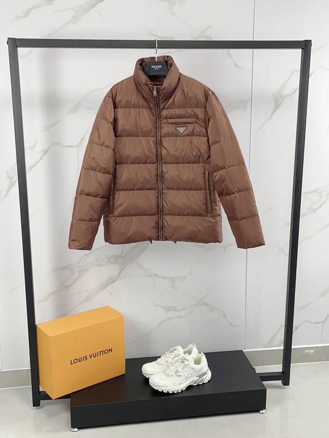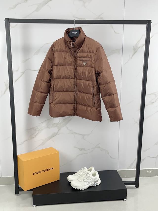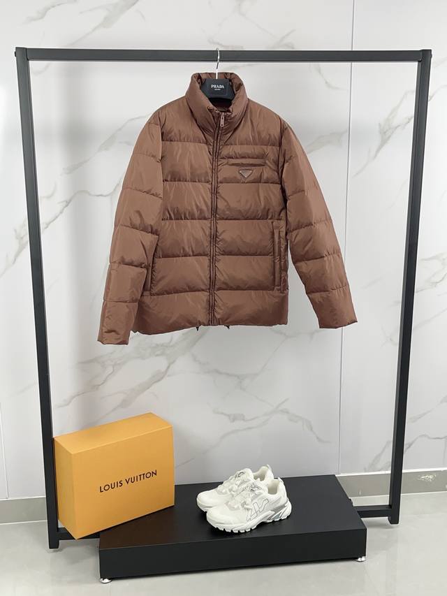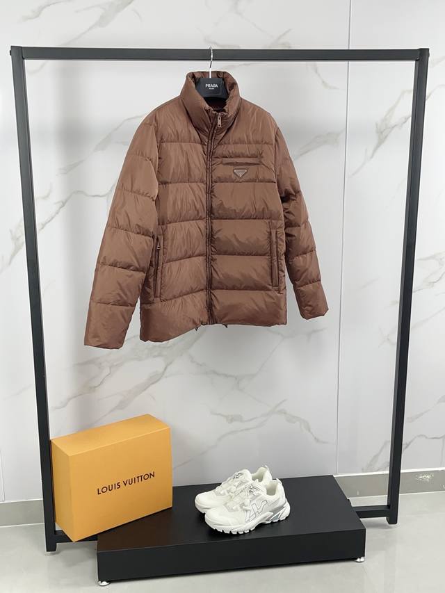 Prada Fall/Winter 2025 Down Jacket. Features a classic stand-up collar, lightweight, fluffy, warm, and comfortable design. A classic, versatile, and practical piece, guaranteed high quality. Down jackets are a wardrobe essential with high versatility, offering a stylish and modern look. Lightweight and warm! A truly sophisticated and high-street style!