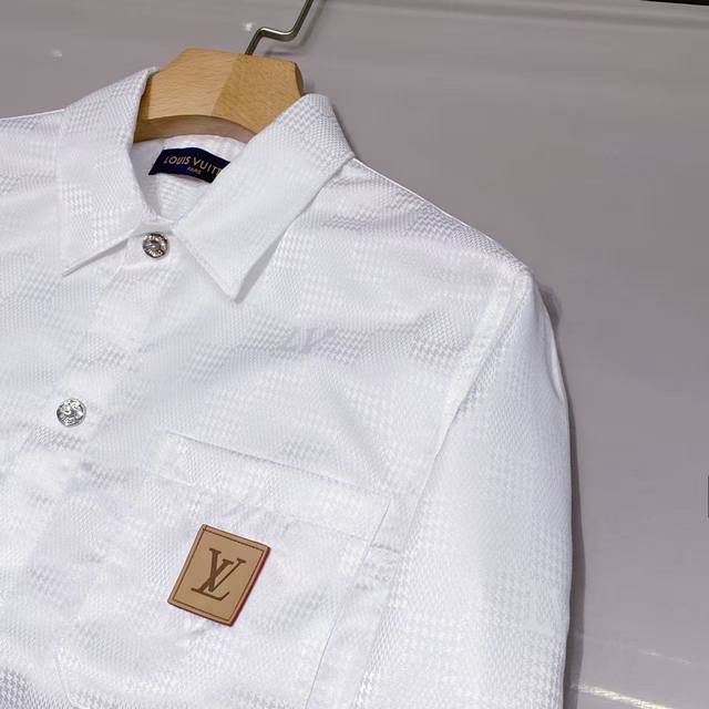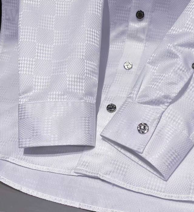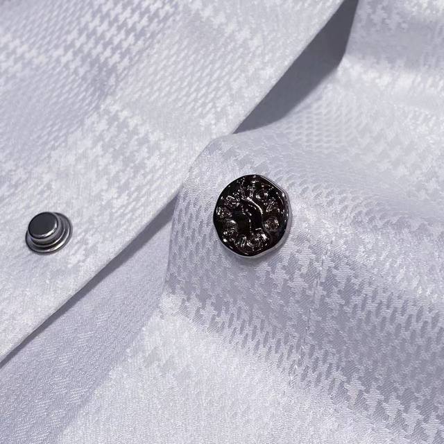 shirt features a quilted cannage pattern with the brand logo printed throughout. The double-layered design with inner lining provides exceptional texture and comfort. The textured fabric exudes luxury and sophistication, with meticulous attention to detail and impeccable craftsmanship, adhering strictly to Italian standards. The buttons are custom-designed logo snap buttons, each with a unique font, adding to the overall premium feel. This highly practical