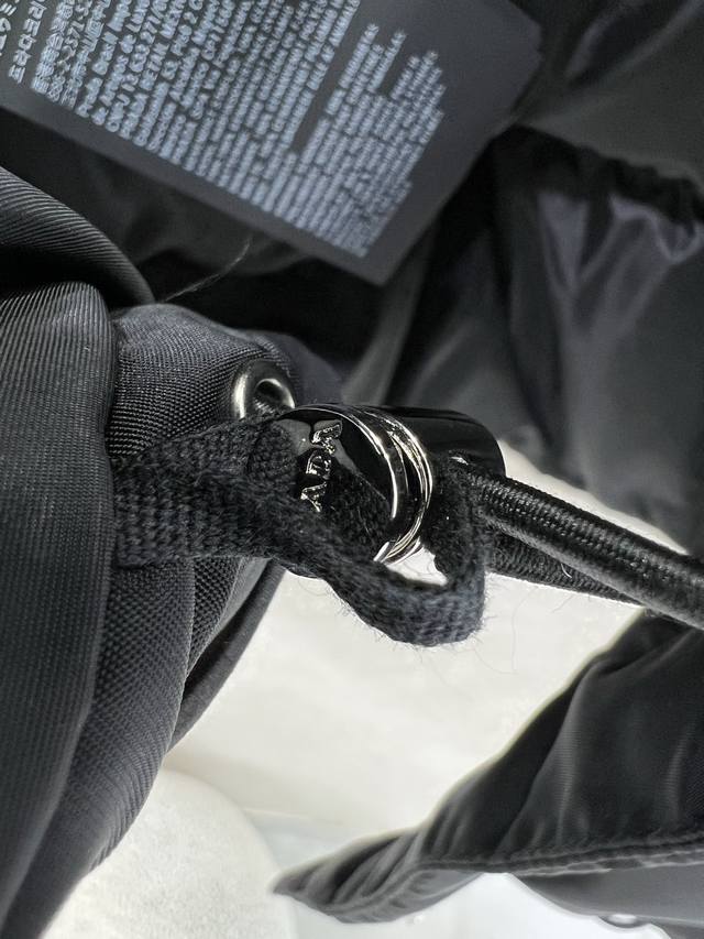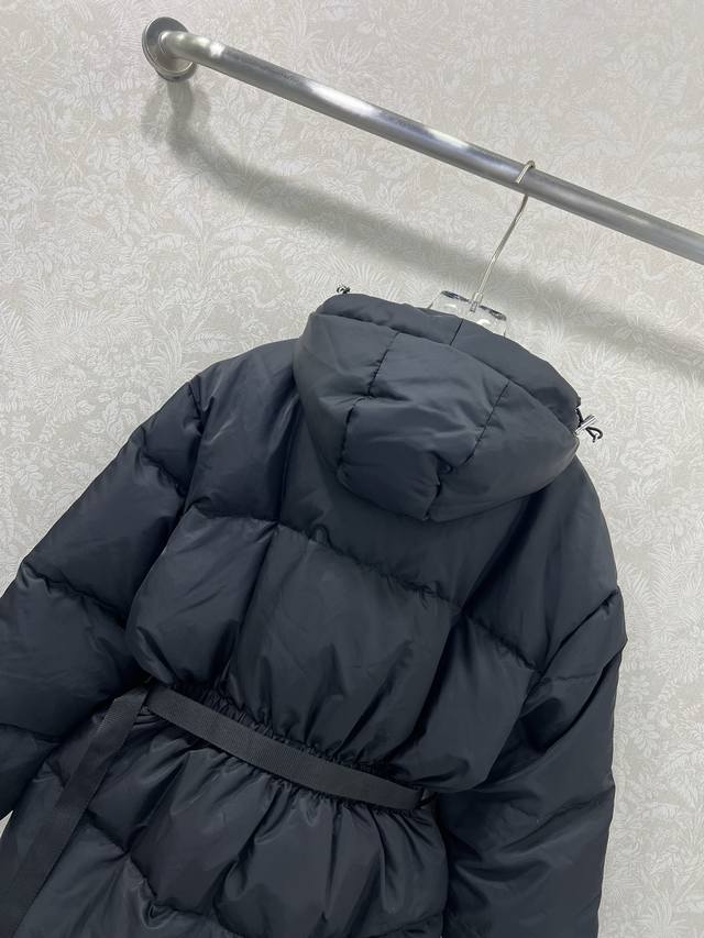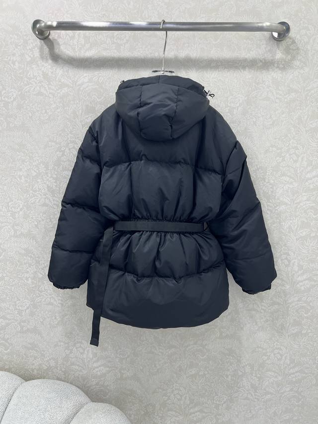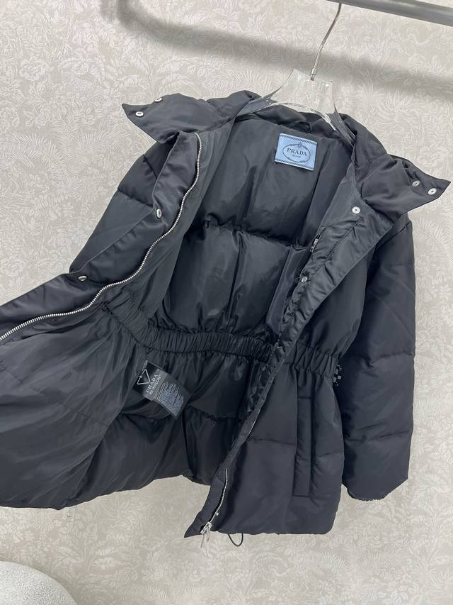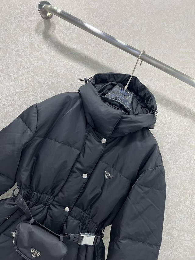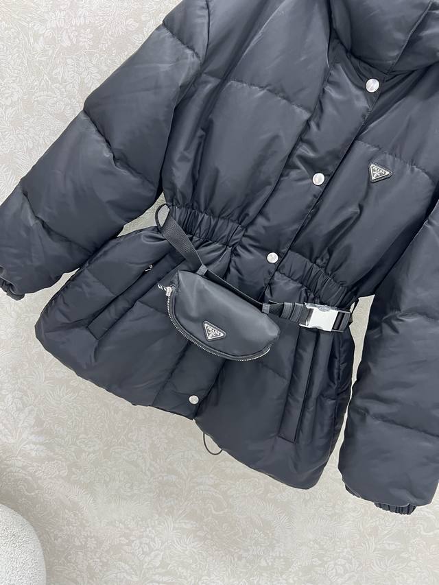 Prad* Pd 25 Latest Style White Goose Down Jacket with Waist Bag - A Must-Have for Fashionistas! This season's best fit: a puffer jacket that accentuates the waistline for a super slimming effect. The hooded design is stylish and chic. I absolutely love it! I'm keeping one for myself! Standard 90% white goose down filling. Pay attention to details to differentiate versions. Original imported recycled nylon fabric, crisp and structured texture. 2 colors, 3 sizes: S, M, L, D.