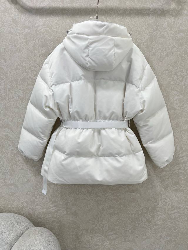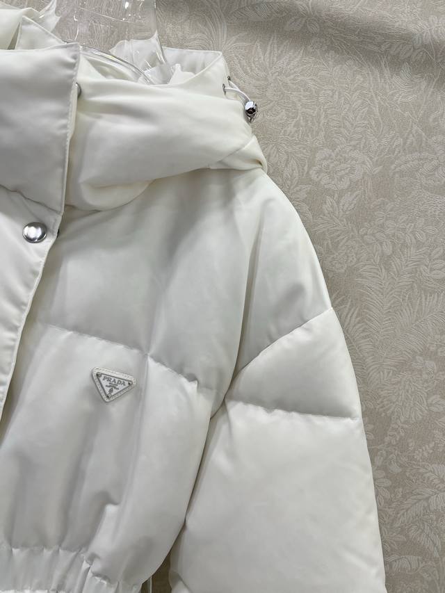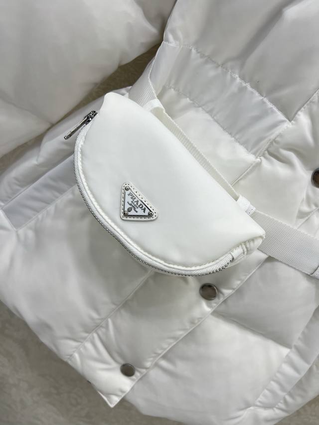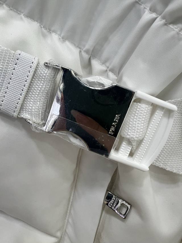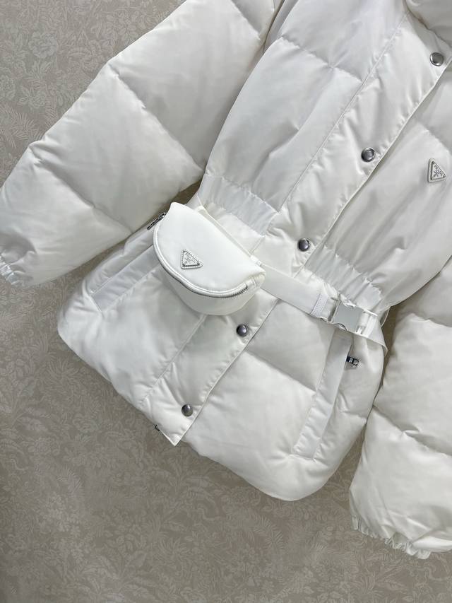 Prad* Pd 25 Latest Style White Goose Down Jacket with Waist Bag - A Must-Have for Fashionistas! This season's best fit: a puffer jacket that accentuates the waistline for a super slimming effect. The hooded design is stylish and chic. A must-have for fashionistas! National standard 90% white goose down filling. Note the details to differentiate versions. Original imported recycled nylon fabric, with a crisp and structured texture. 2 colors, 3 sizes: S, M, L, D.