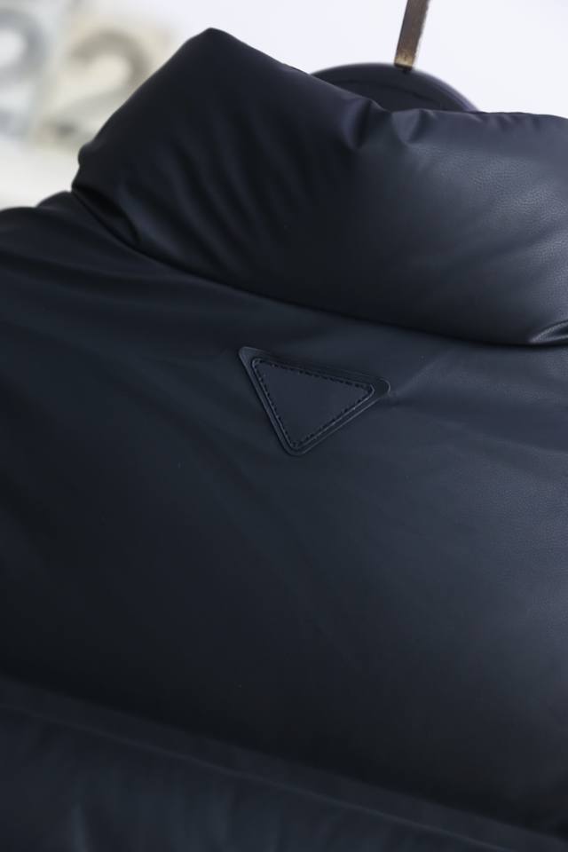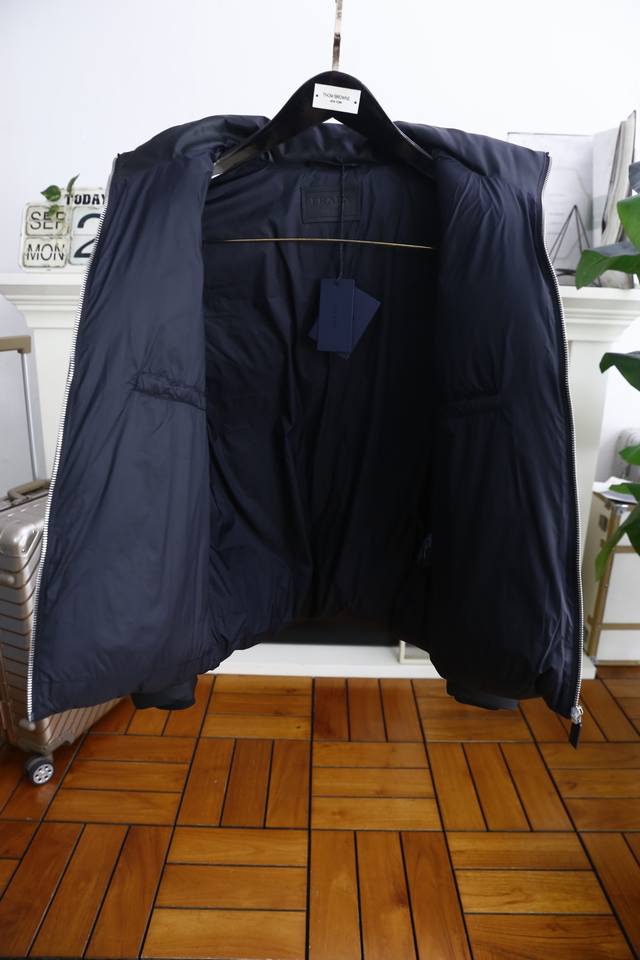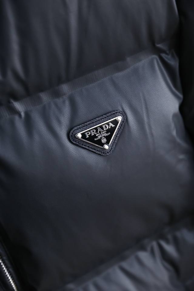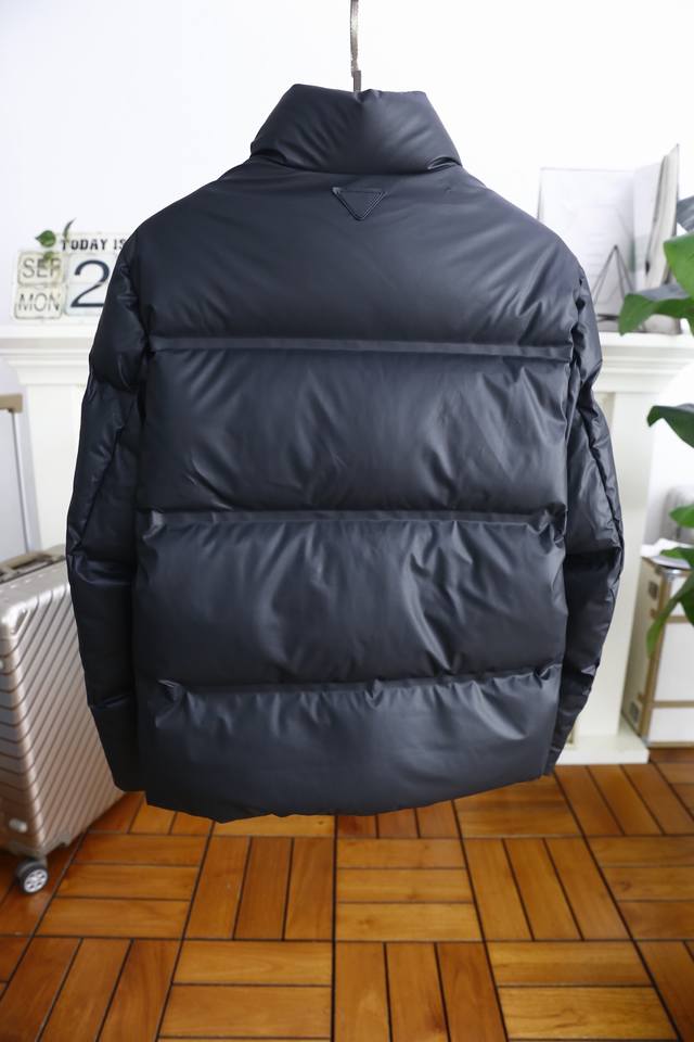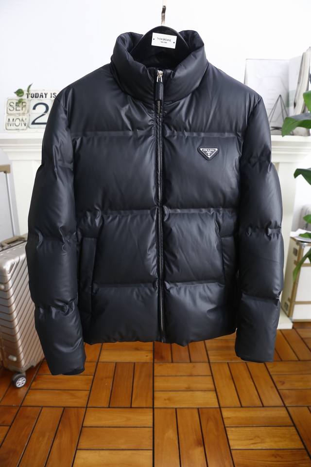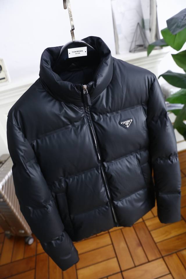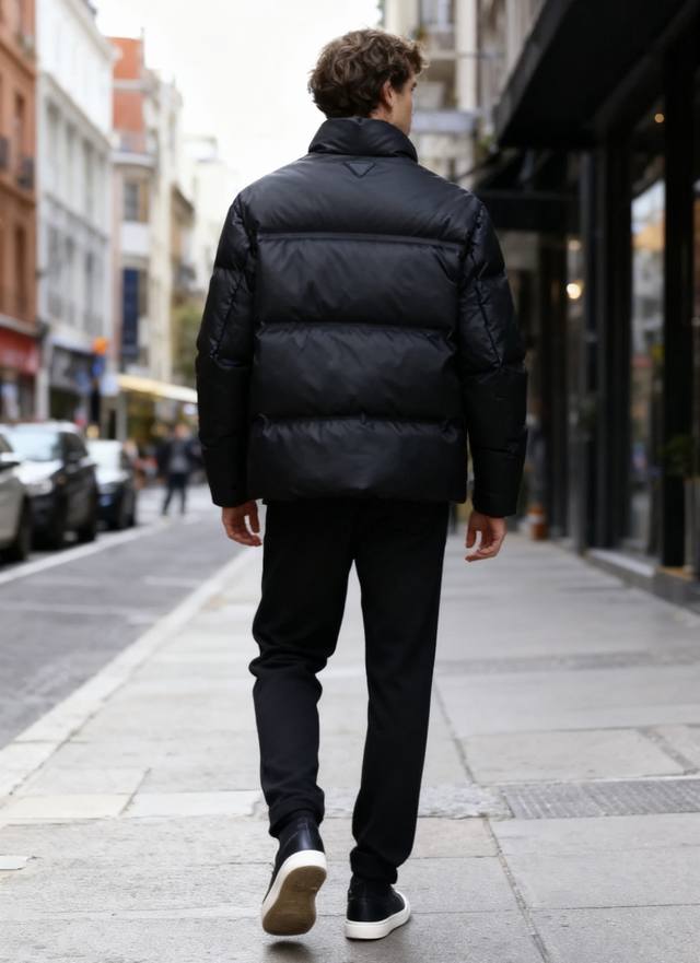 Prada Men's Black Stand-up Collar Down Jacket (2025 Fall/Winter). Featuring Prada's iconic triangular logo on the chest, this jacket is highly recognizable. The lining is made of 90% new national standard duck down in black glossy fabric. It features a stand-up collar and zipper design, with a simple yet sophisticated overall style that combines warmth and fashion. Prada is a top Italian luxury brand renowned for its avant-garde design and high-quality craftsmanship. Its down jacket collections often blend functionality with luxurious style. This jacket embodies the brand's classic style in fall/winter designs, suitable for creating a high-end casual or urban chic look. All three labels are included! Available in