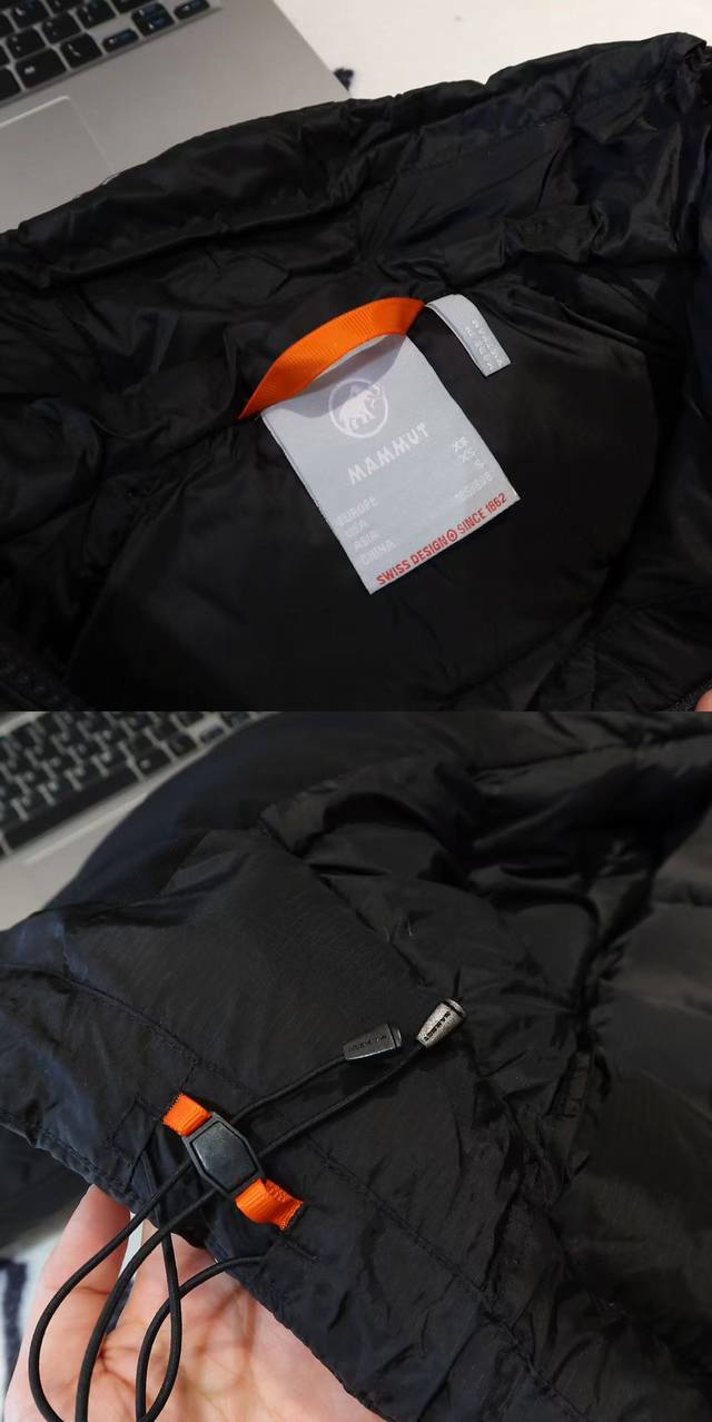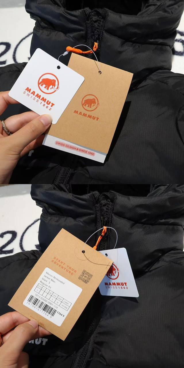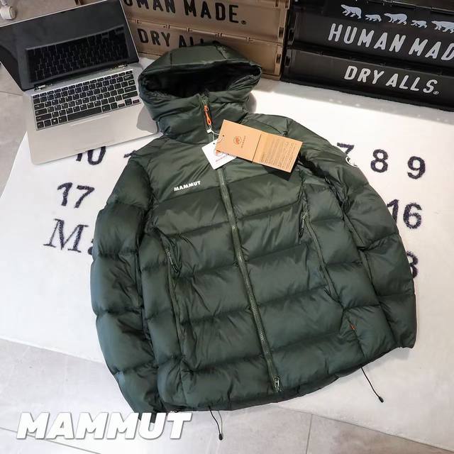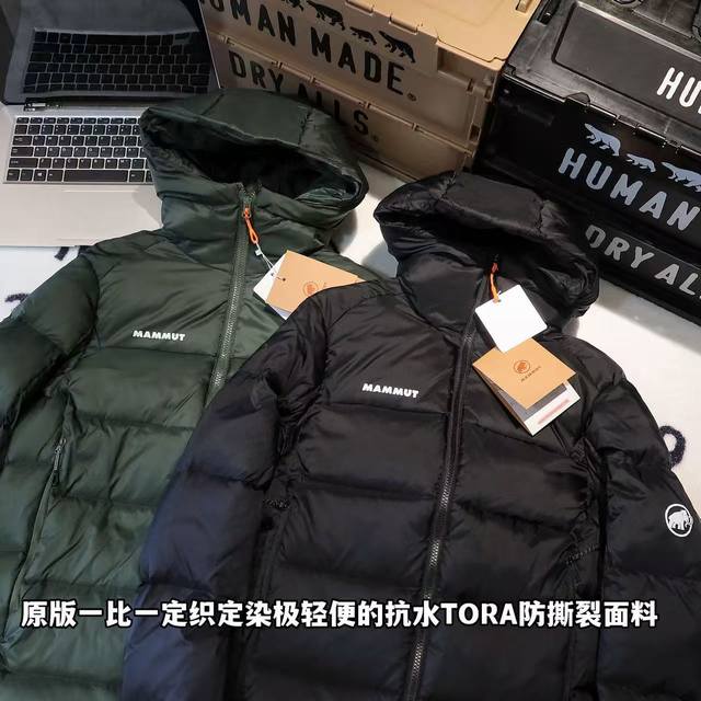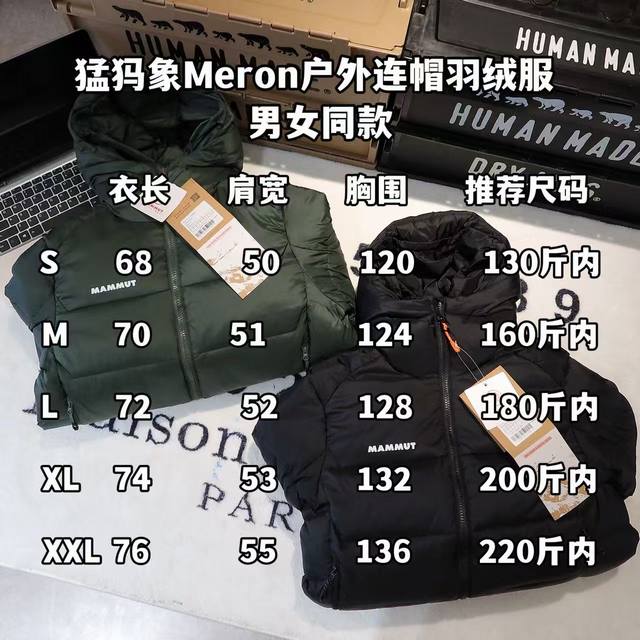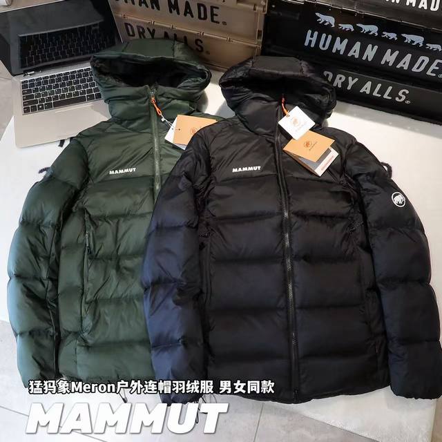- Mammut Meron Outdoor Hooded Down Jacket, Unisex. Fabric: 1:1 replica of the original, custom-woven and dyed ultra-lightweight, water-resistant Tora ripstop fabric. Accessories: 1:1 customized small labels, neck labels, wash labels, hang tags, hardware, etc., based on the original design. Features include a Ykk Vislon front two-way zipper for smooth operation, two zippered pockets compatible with backpacks and climbing harnesses, and two interior pockets made of elastic mesh. Craftsmanship: Completely 1:1 replica of the original design, from cutting and splicing to sewing.