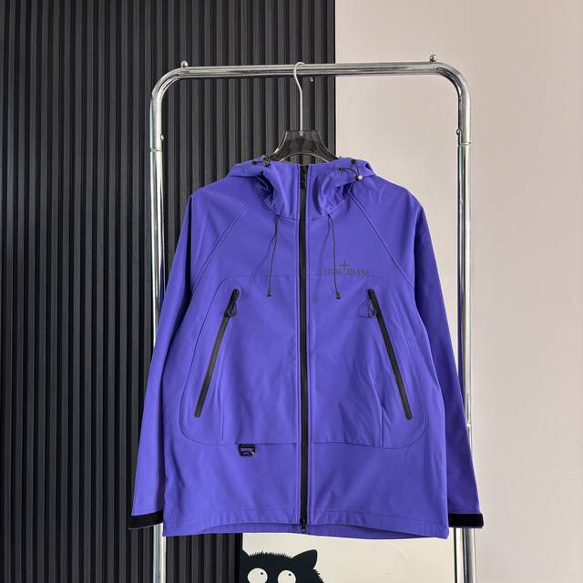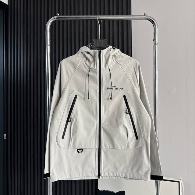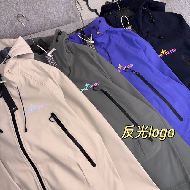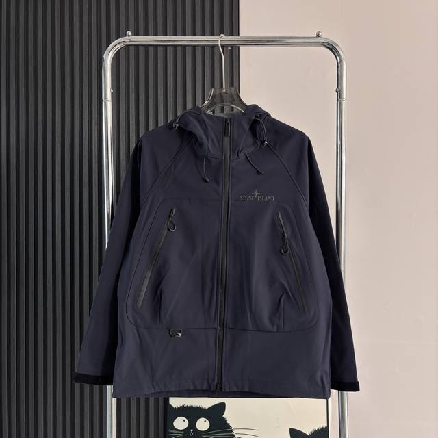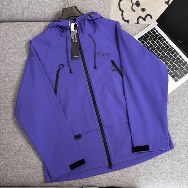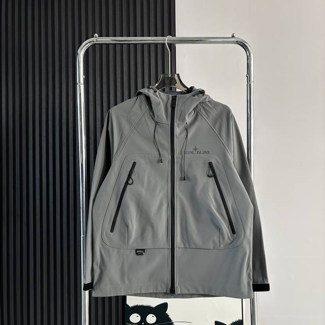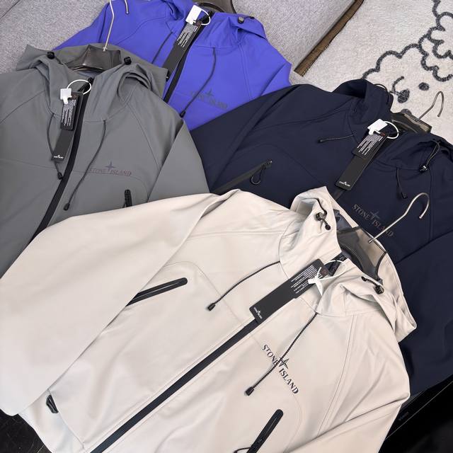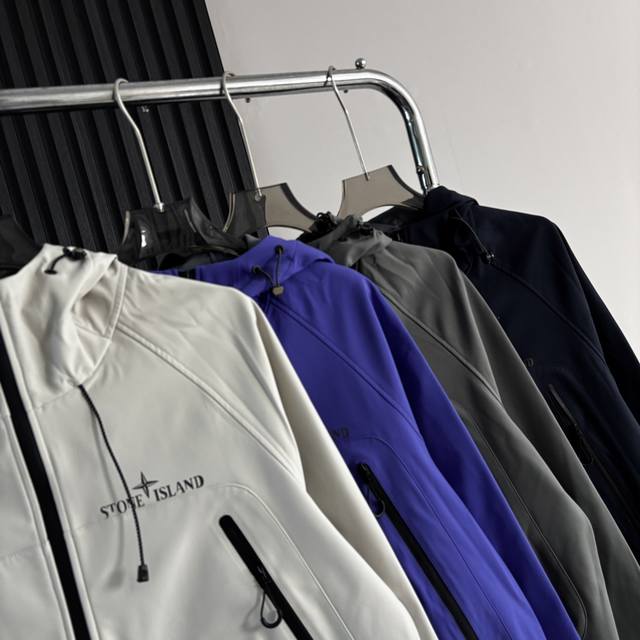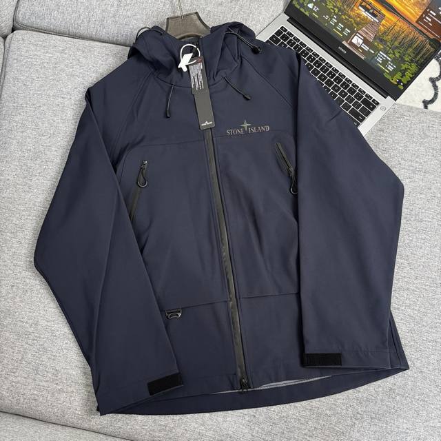 Stone Island Hooded Softshell Jacket Features a classic reflective logo, 3D tailored fit, and a slimming effect. High-tech fabric is key! This fabric is said to retain body heat and provide insulation. The workmanship is also quite complex, far beyond what a small factory could achieve. It includes many intricate details, such as numerous seams. Excellent waterproof performance, scratch-resistant, stain-resistant, and waterproof