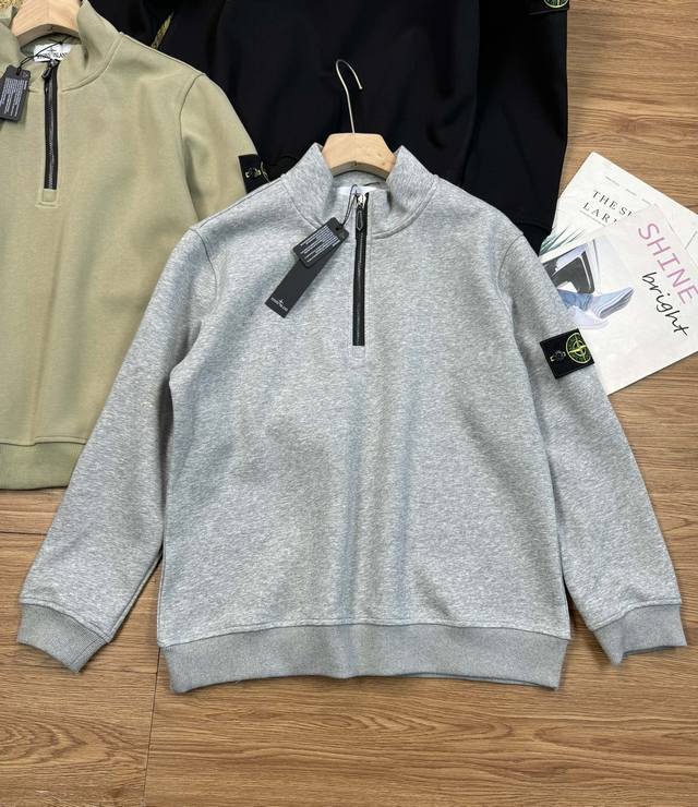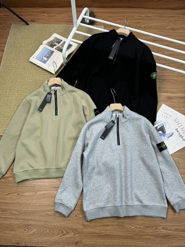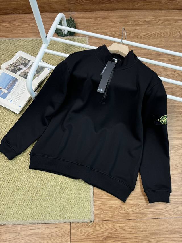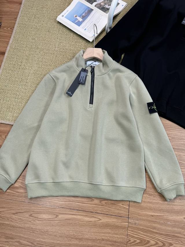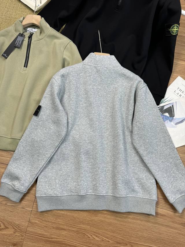 Stone Island New Pure Cotton Knit Half-Zip Casual Long-Sleeve Sweatshirt. Features a half-zip stand-up collar design, offering two ways to wear it. It's flexible and easy to put on and take off for sports. The newly upgraded air-layer fabric is super soft, lightweight, breathable, and has excellent moisture-wicking properties. It's four-way stretchy, not tight, and features a three-dimensional cut, fine and sturdy workmanship from a large factory. The simple colors are versatile and flattering. Perfect for casual wear, daily commutes, and outdoor activities. Colors: Black, Green, Gray. Sizes: M-XL. S: Length 66cm, Chest 110cm, Sleeve Length 56cm, Size 46cm. M: Length 68cm, Chest 114cm, Sleeve Length 57.5cm, Size 47cm. L: Length 70cm, Chest 118cm, Sleeve Length 59cm, Shoulder Width 48cm. XL: Length 72cm, Chest 122cm, Sleeve Length 60.5cm, Shoulder Width 49cm.