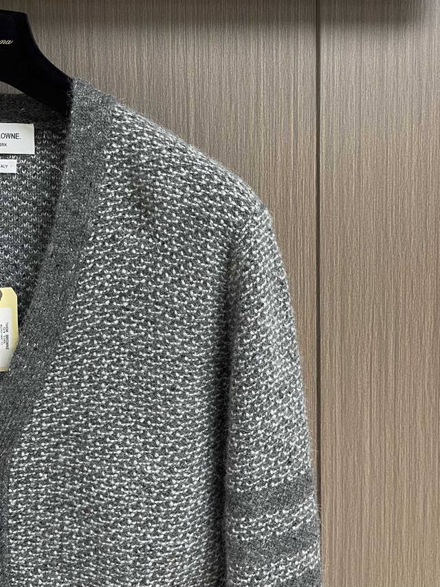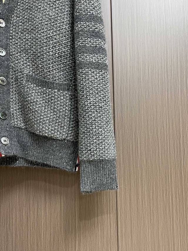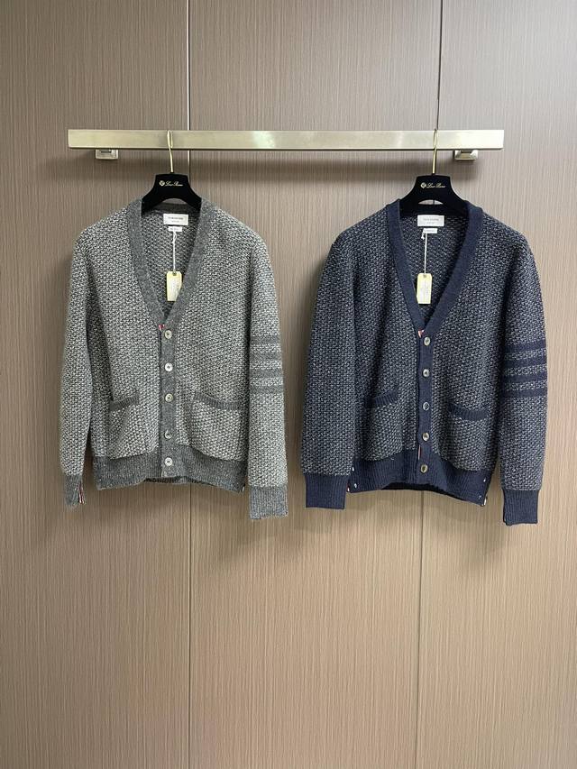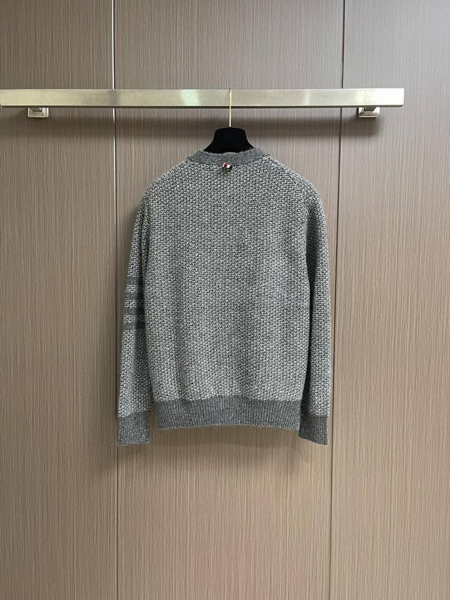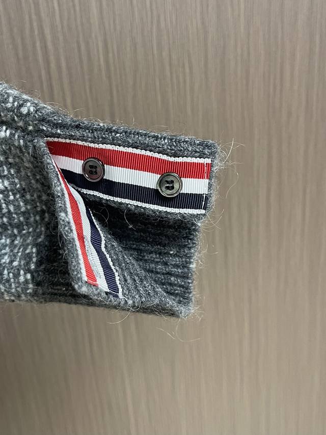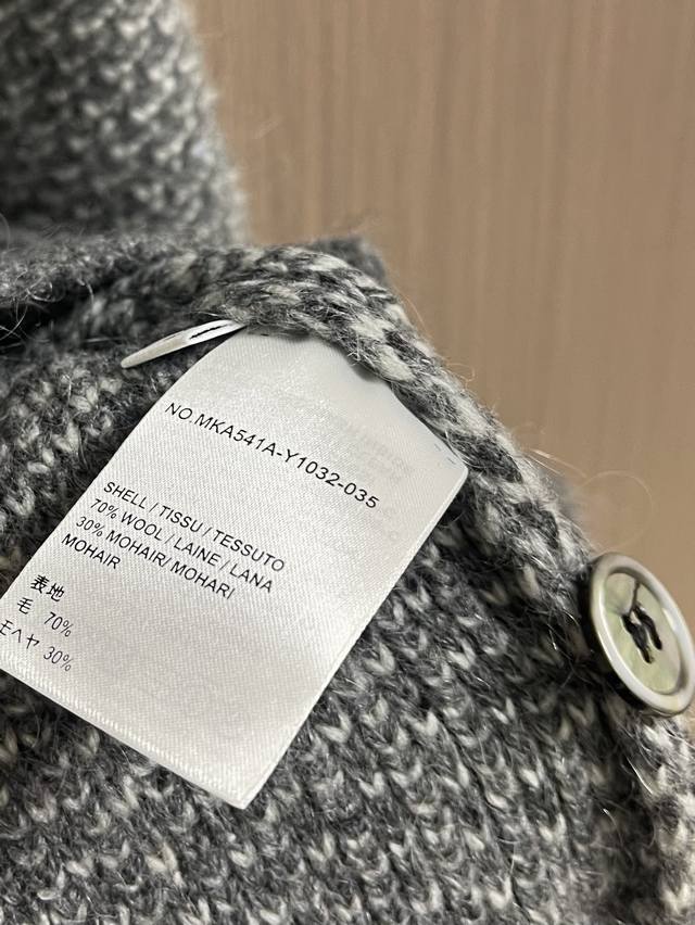 Thombrowne Tb Chunky Knit Wool Cardigan, made with high-density, high-knit wool fabric using 357 gauge imported from Germany. The fabric is made with wool yarn and 7-ply thickened mohair yarn. It features four stripes in the same color for a subtle yet sophisticated look. All accessories are of the highest quality. Each natural deep-sea tarot shell button has a unique, natural texture. The cardigan is decorated with three-color 2.5cm ribbon. Custom-made in Taiwan. Sizes: 1-2-3-4
