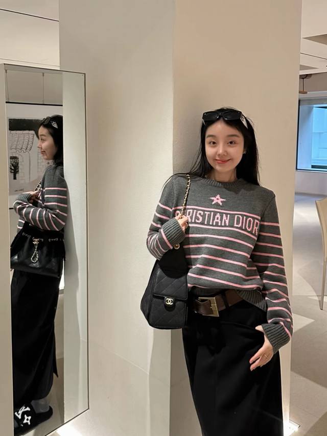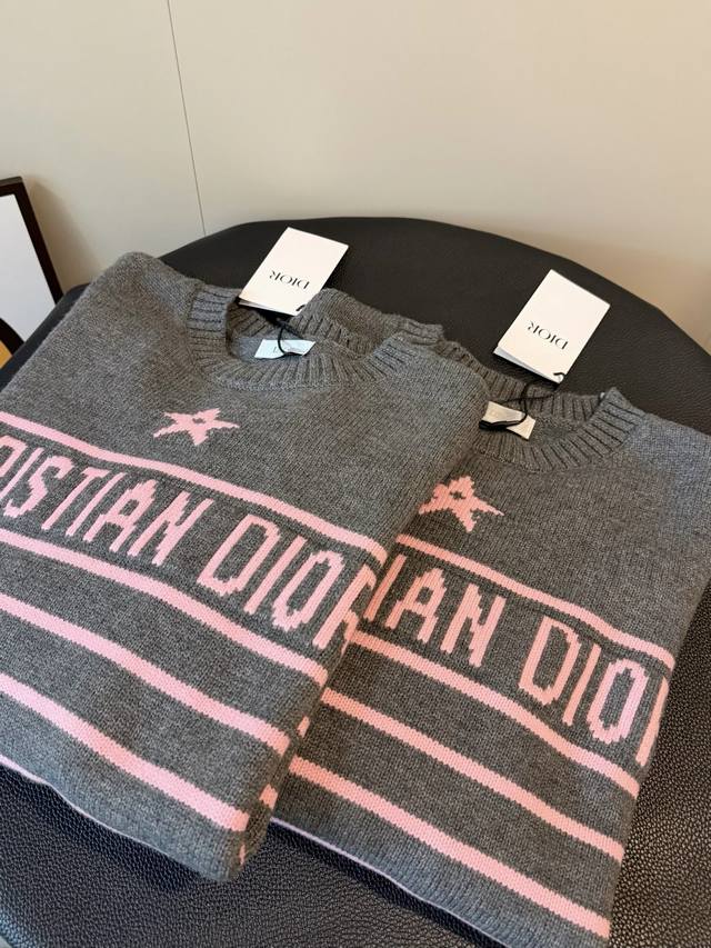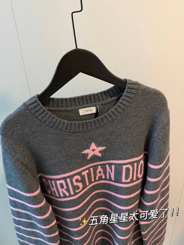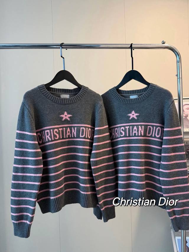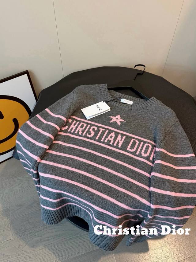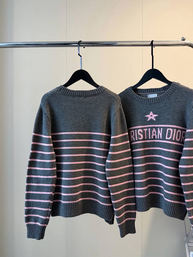 Christian Dior New Pink Star Striped High-Grade Grey Crew Neck Sweater
