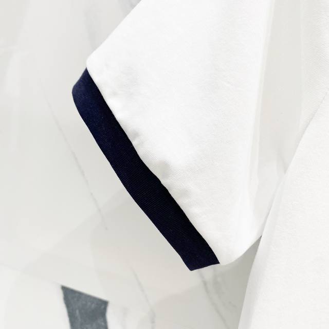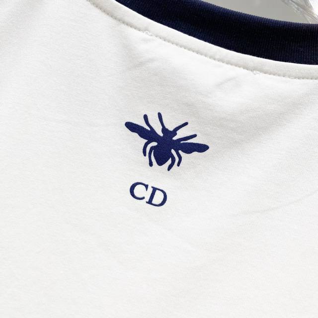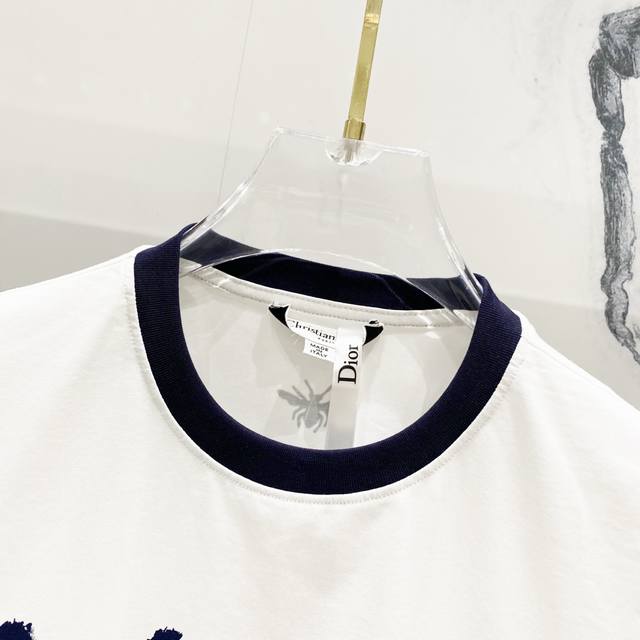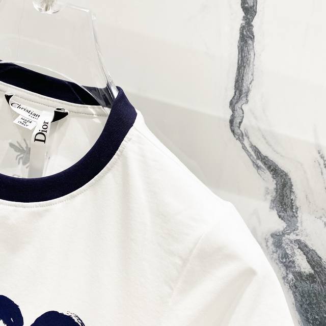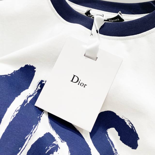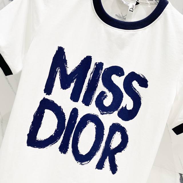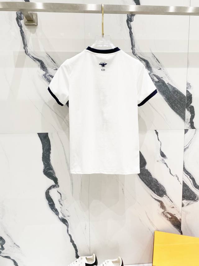Women's Dior 2025 New Style, 50-count Double Ice-Cool Cotton G Fabric, Contrasting Collar with Direct-Injection Logo Print, Official High-Version Synchronized, Fashionable, Versatile, Trendy, Pure Original Quality Fabric, Complete with Hangtag, Neck Label, Washing Label, and Three Labels, Colors: Red Collar White, Blue Collar White. Sizes: SL