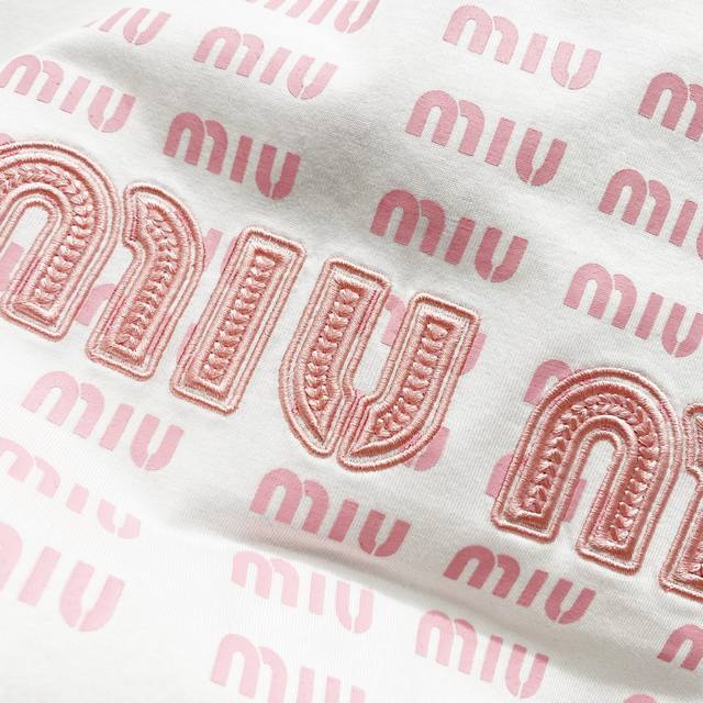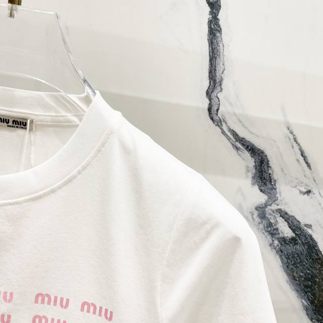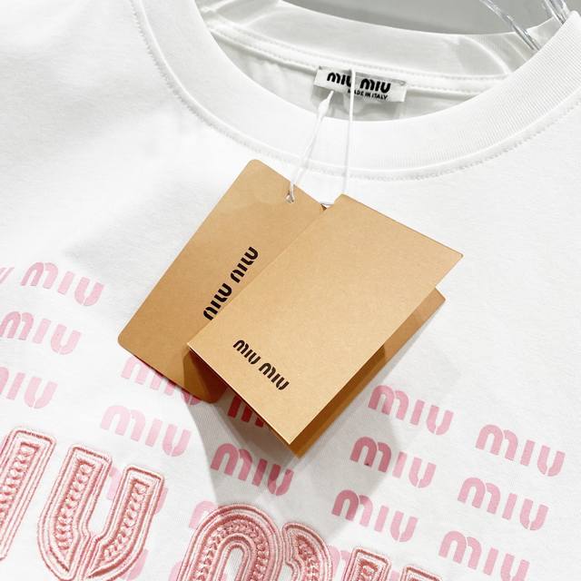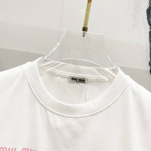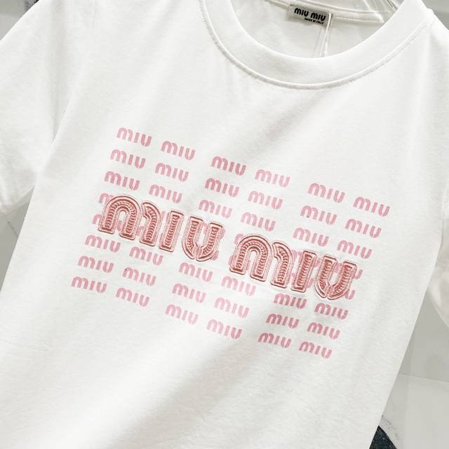 Women's Miu Miu 2025 New Arrival, 50-count Double Ice-Cool Cotton G Fabric, Embroidered Letter Small Logo Print, Official High-Quality Version, Fashionable, Versatile, Trendy, Pure Original Quality Fabric, Complete with Hangtag, Neck Label, Washing Label, and Three Tags, Colors: Black, White, Sizes: SL