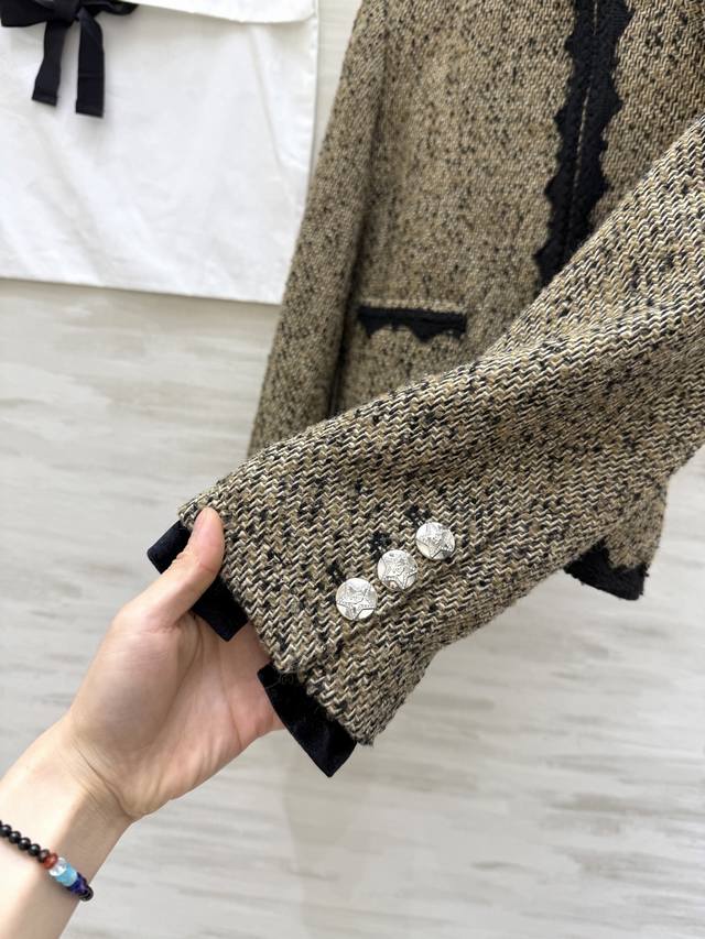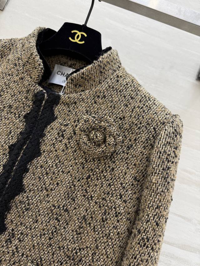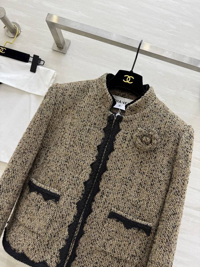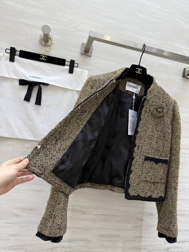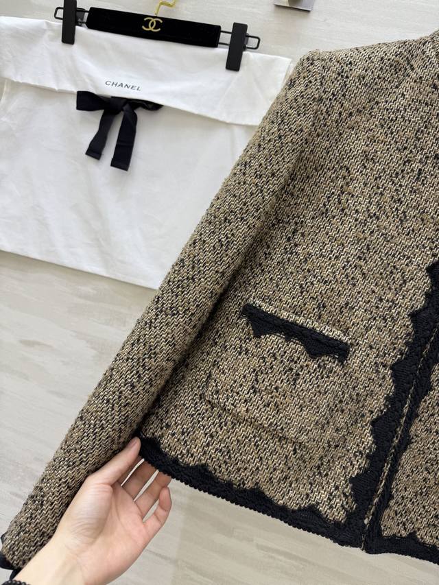 Chane2 Early Spring New Classic Tweed Jacket. Beige blend tweed with black woven trim, exuding elegant retro charm! The camellia brooch on the chest is highly recognizable. The tweed material adds a touch of sophistication! Easily suitable for commuting, parties, and formal occasions. Pairs well with skirts or high-waisted trousers! Achieve a sophisticated look effortlessly. High-quality custom-made, in-stock, first release. Size: SMLS, Bust: 90cm, Length: 49cm. DDD