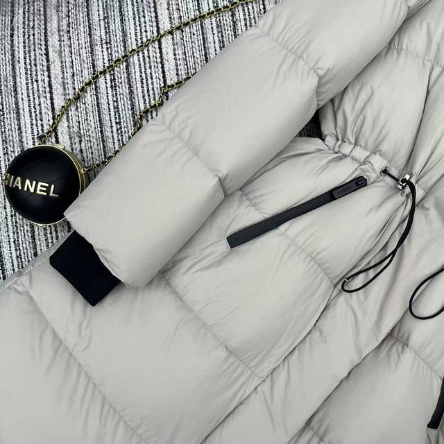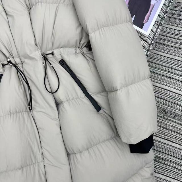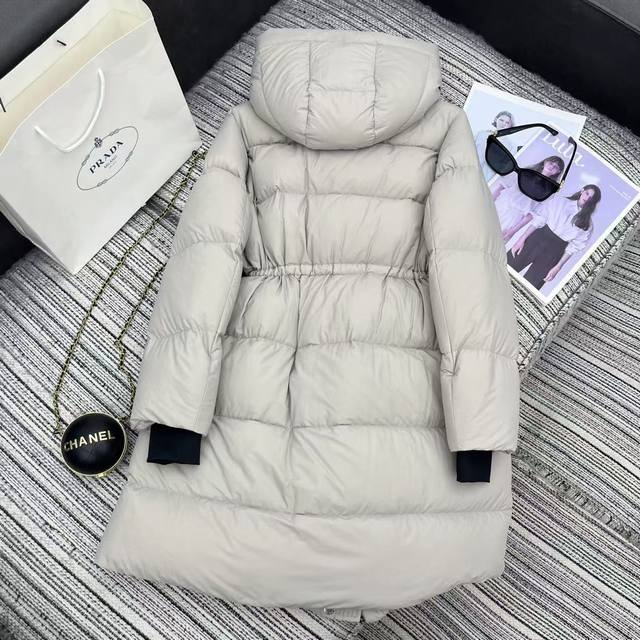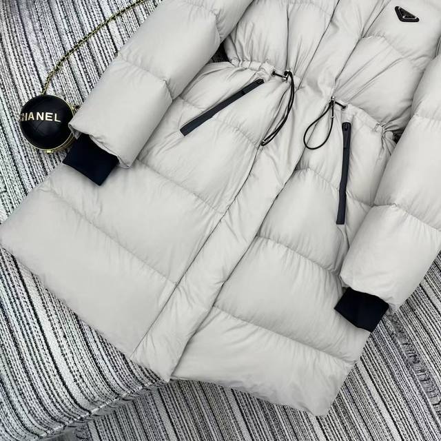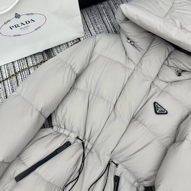 Highly recommend the 2025 early autumn/winter collection pra* new hooded down jacket, mid-length coat, drawstring waist design, classic inverted triangle logo leather patch embellishment, lightweight and full 90% white goose down filling, high-end quality, three colors and three sizes, high-volume sales. DDD