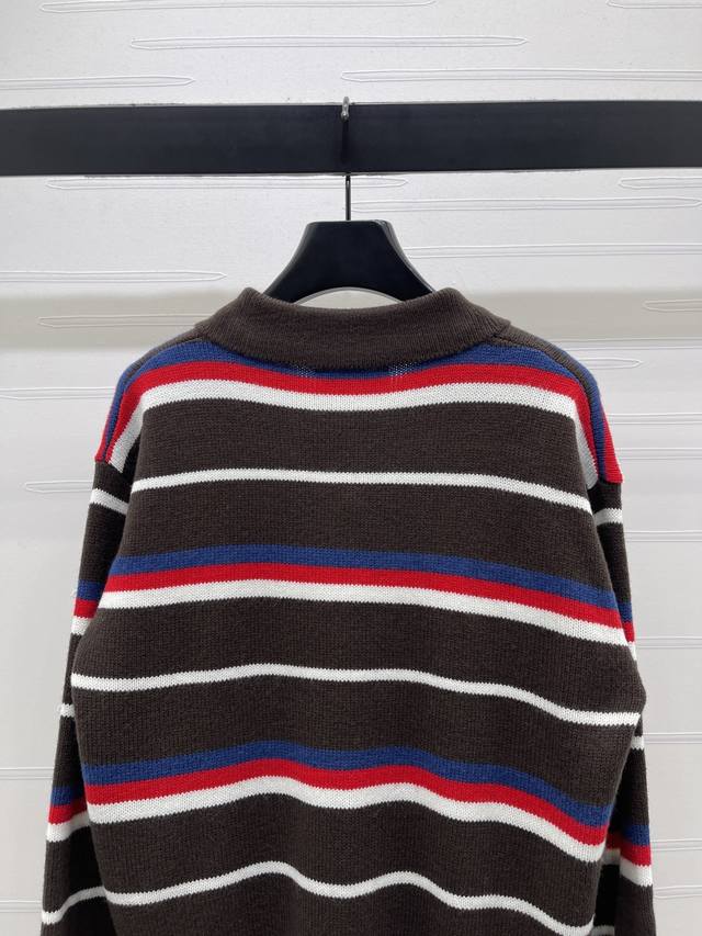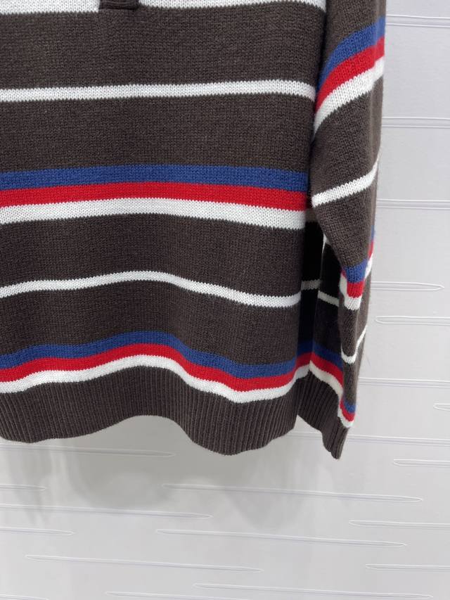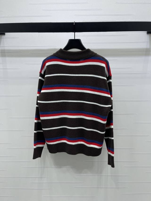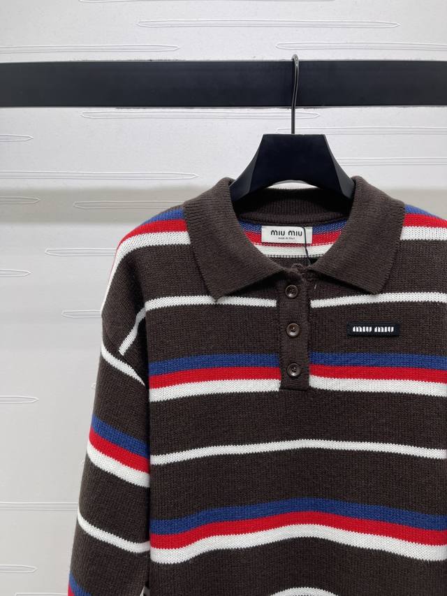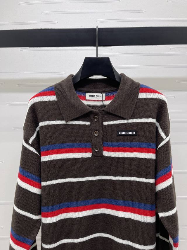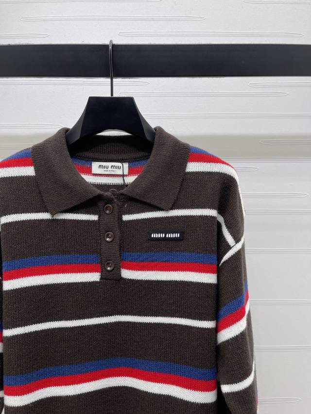 New Arrival: High-end Original Miumi* 2025 Autumn/Winter Collection! Striped polo knit sweater in navy and beige color blocking, full of retro preppy style! High-quality knit fabric, soft and skin-friendly, super comfortable to wear in autumn and winter. Classic polo collar + three buttons, exquisite details, highly recognizable. Loose fit, great for wearing alone or layering, easy to manage for both work and leisure. Pair with jeans or casual pants for a casual yet stylish look! 2 colors! Sizes SM-L3! High-quality bulk goods A706B340C DDD