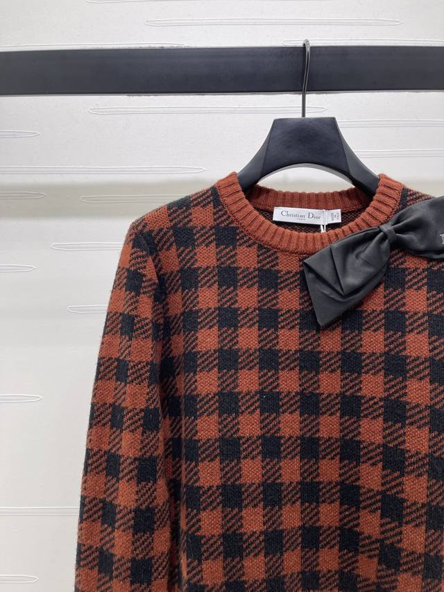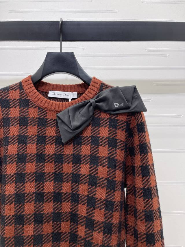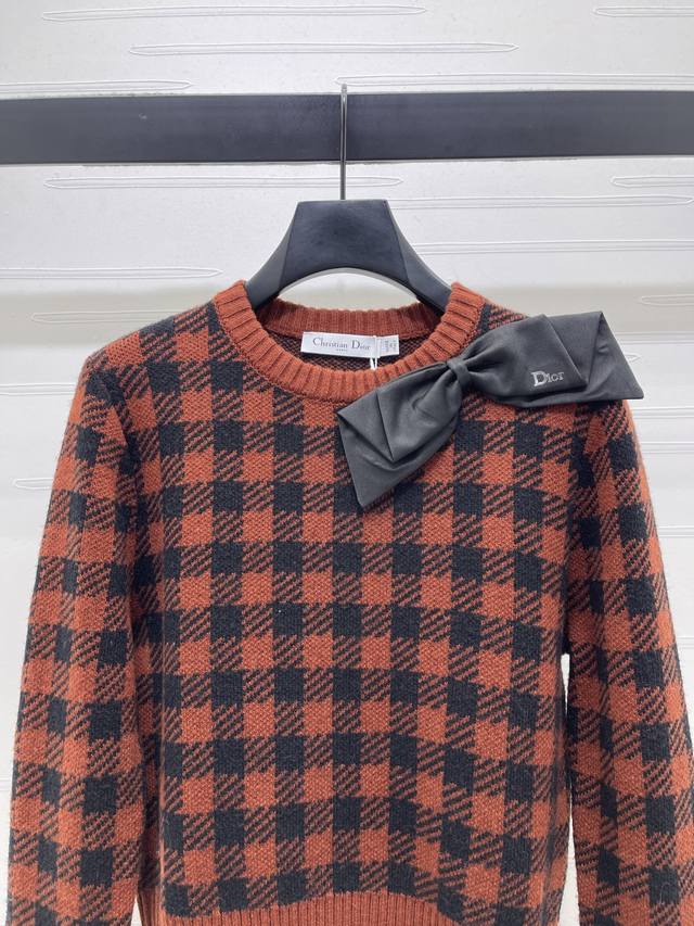 New Arrival! High-Quality Original Dio* 2026 Latest Collection! Checkered Bow Knit Pullover Sweater! Crafted from custom Yb wool yarn, comfortable to wear and exuding a premium feel. The round neck pullover sweater features a navy houndstooth pattern for a retro vibe, while the navy bow on the shoulder adds a touch of sweetness. The classic knit sweater cut elongates the legs, perfectly balancing French elegance with a youthful charm. Perfect for autumn and winter, pair it with a skirt or jeans for an instantly captivating and sophisticated look. It also gives off a sweet and playful vibe! Available in 2 colors! Sizes SM-L3! High-quality bulk order A706B400C DDD