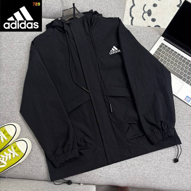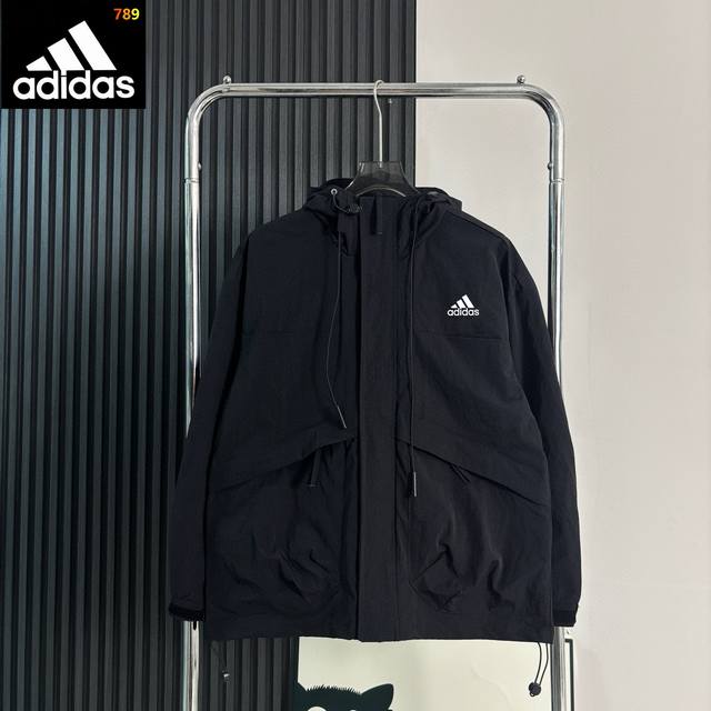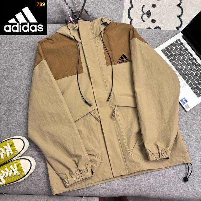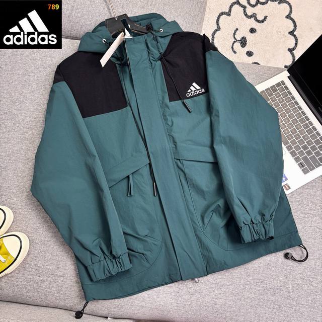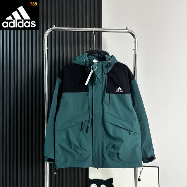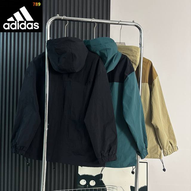 Adidas color-blocked hooded jacket. Classic small reflective logo, high-density