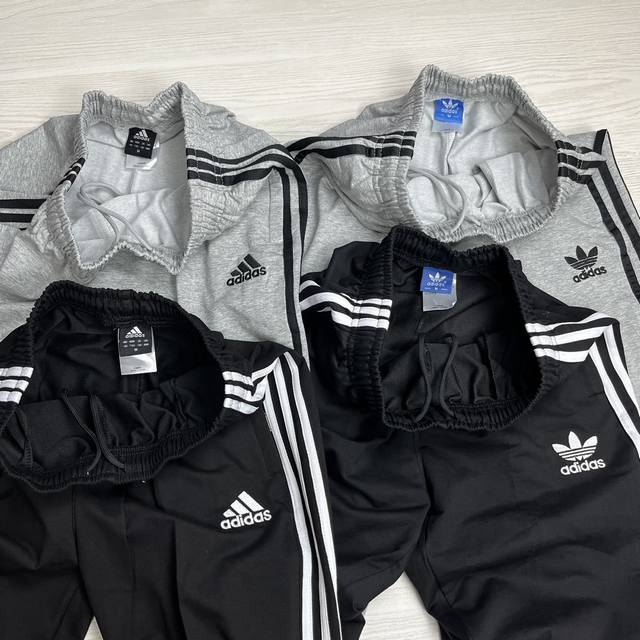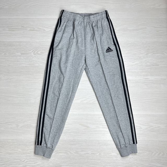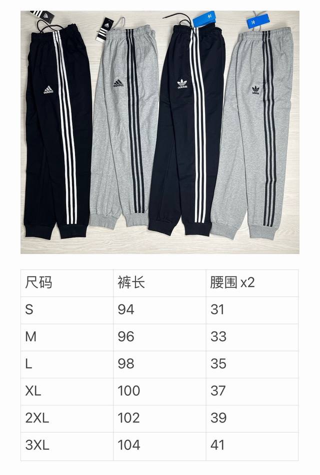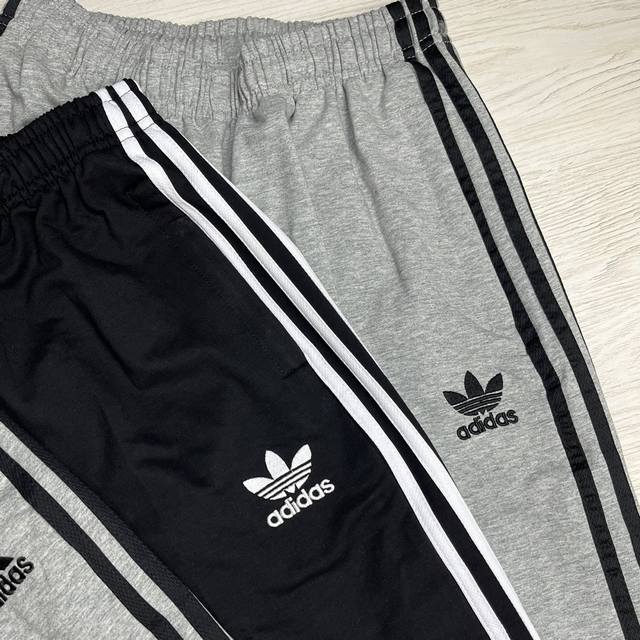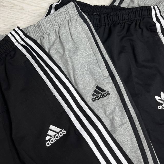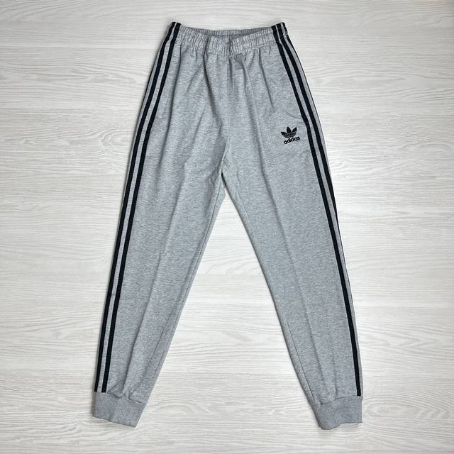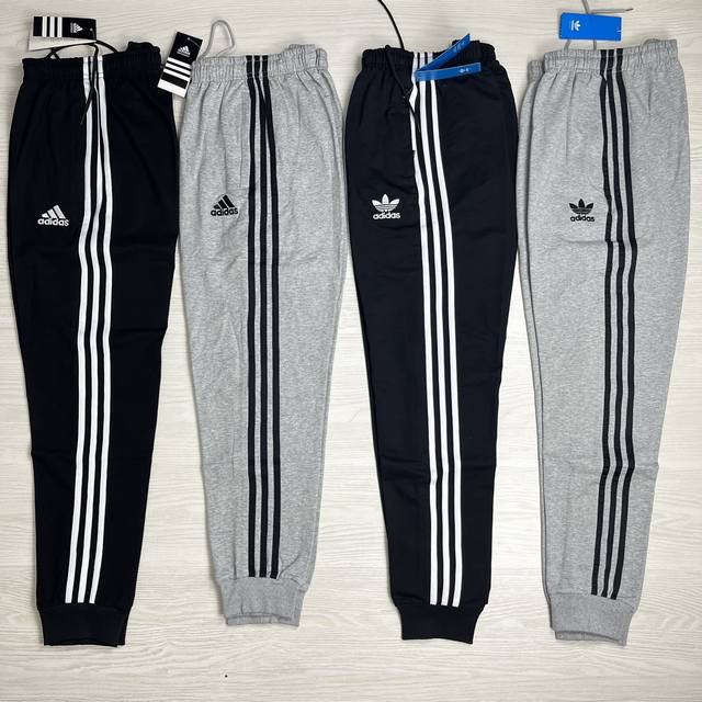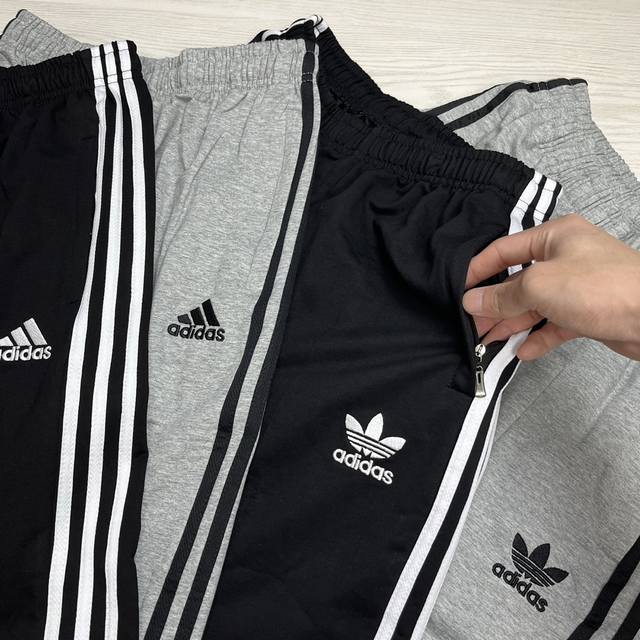 Adidas Originals classic embroidered three stripes athletic pants, spring/autumn style, pure cotton terry cloth fabric, soft, delicate and comfortable, loose fit, S-3XL, drawstring cuffs, two-tone design, zippered pockets.