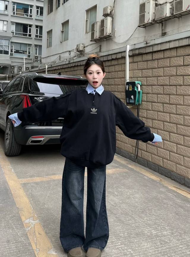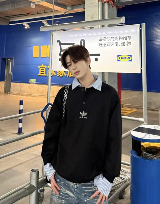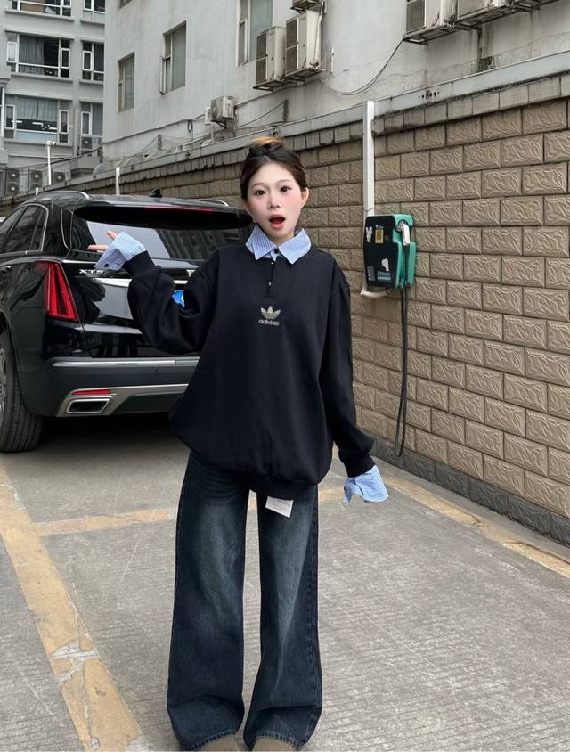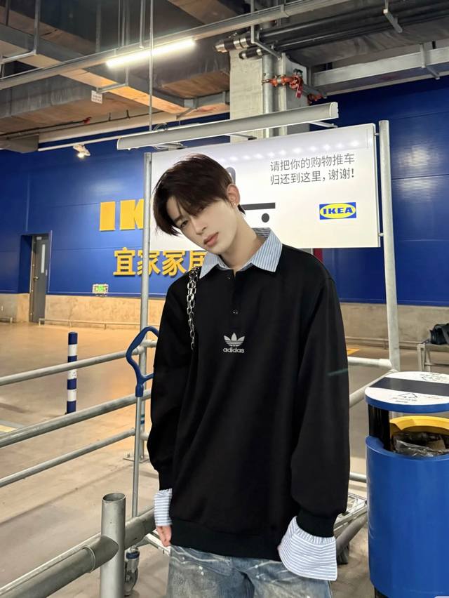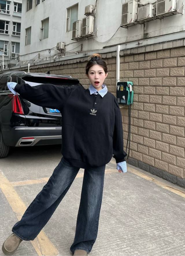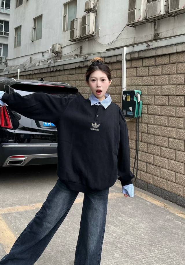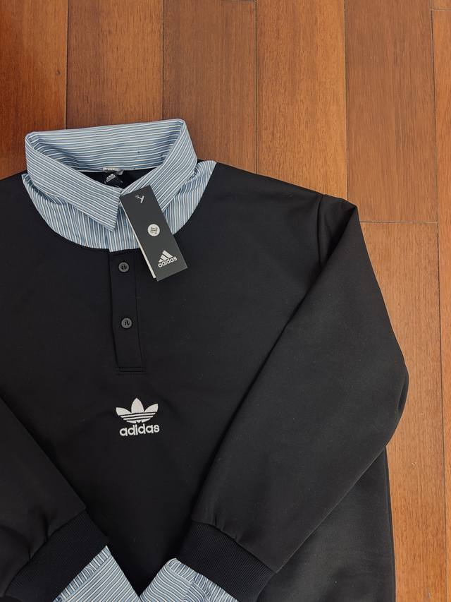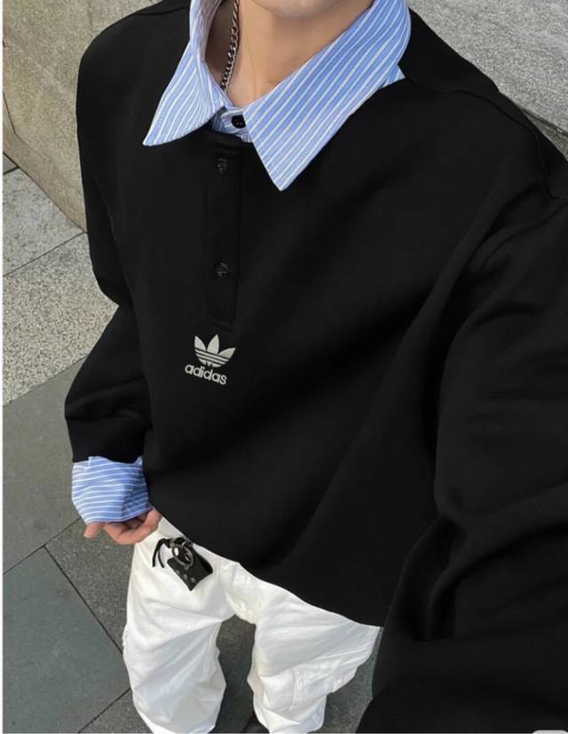 Adidas Trefoil Buttoned Half-Collar Sweatshirt, Fake Two-Piece Drop Shoulder Sp