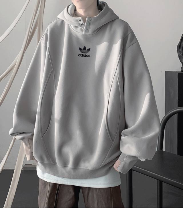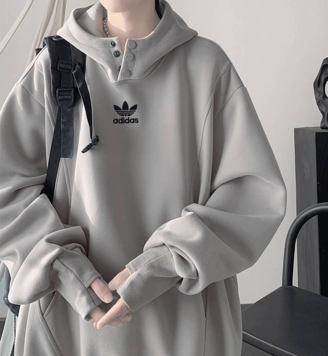 Adidas Turtleneck Button-Panel Hooded American-Style Drop Shoulder Sweatshirt. Unisex Hoodies. High Street Casual Hoodies with Drop Shoulder Sleeves and a Heavyweight Design.