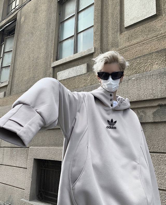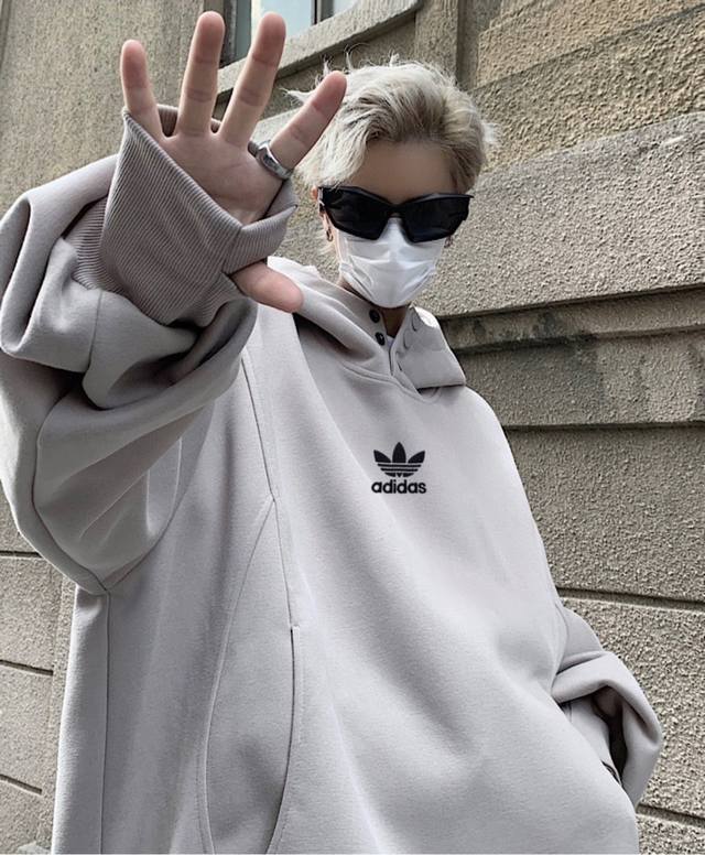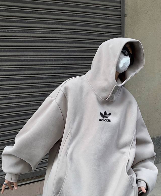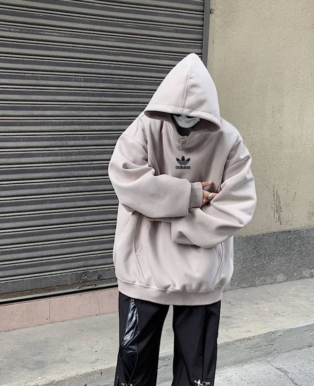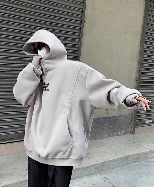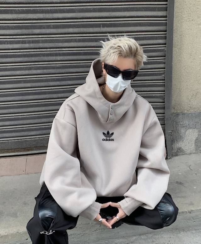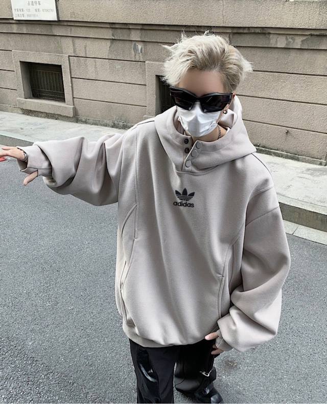 Adidas Turtleneck Button-Panel Hooded American-Style Drop Shoulder Sweatshirt. Unisex Hoodies. High Street Casual Hoodies with Drop Shoulder Sleeves and a Heavyweight Design.