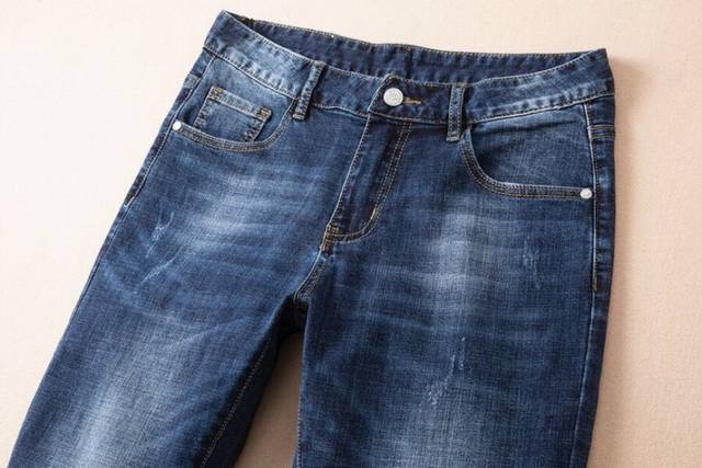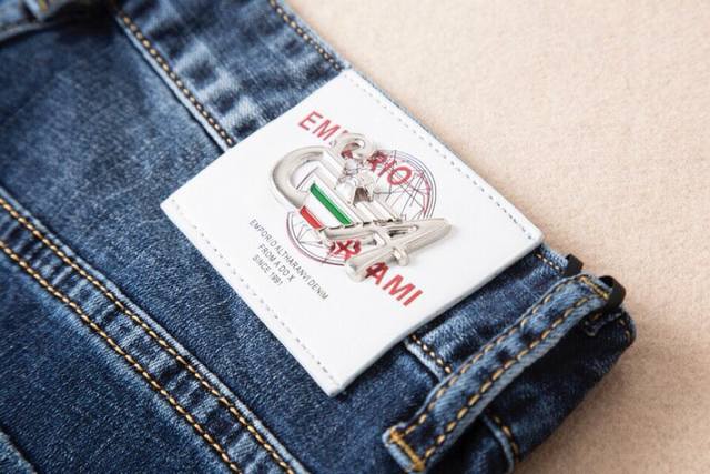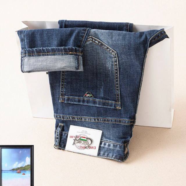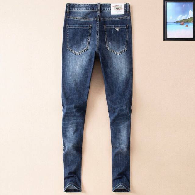 Armani men's spring and summer casual jeans. This is a high-end ready-to-wear collection, a highly designed piece from the official website catalog. Made from a specific denim fabric imported from Italy, it offers a firm, drapey fit. The fabric is highly stretchable, smooth, and delicate, with excellent drape and exceptional comfort. The back pocket features a leather patch with the brand's latest logo, adding a luxurious touch. The craftsmanship and materials are refined, the texture is unmatched, and meticulous attention to detail further highlights its quality. A high-end business casual style. Sizes: 28-36, size 35 available.