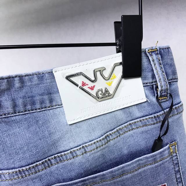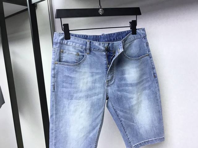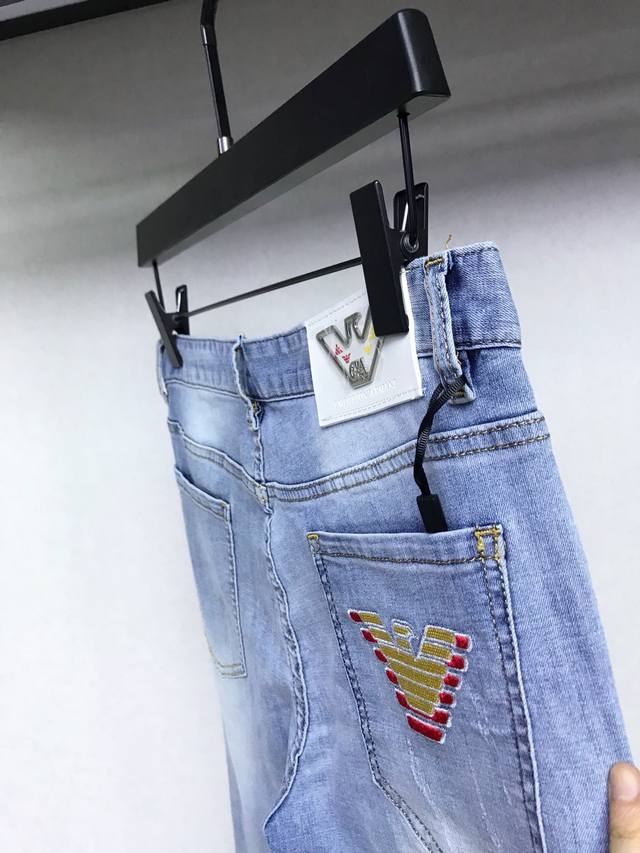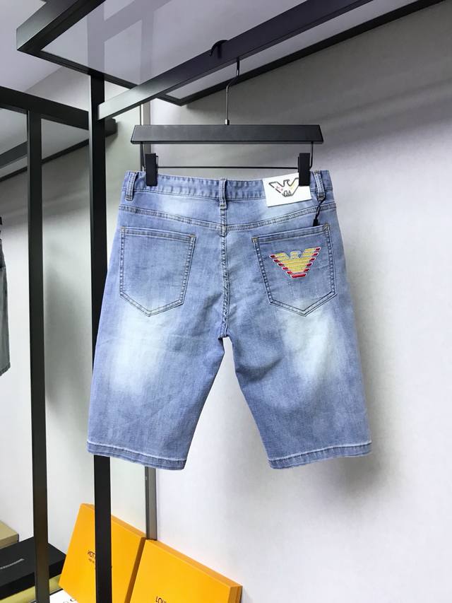 Armani, original foreign trade denim shorts in stock, thin 5-inch shorts, undeniably fine workmanship, logo design, copper hardware, washed, selected high-quality polyester fiber fabric, soft and delicate feel, a must-have summer item, super handsome effect, super realistic shooting, close-up contact texture! Sizes: 29-38.