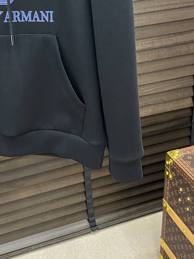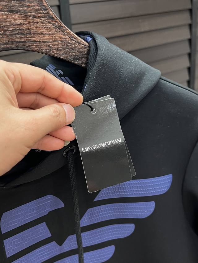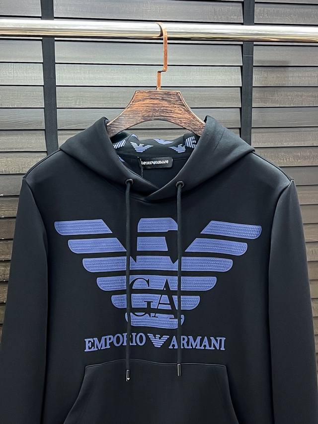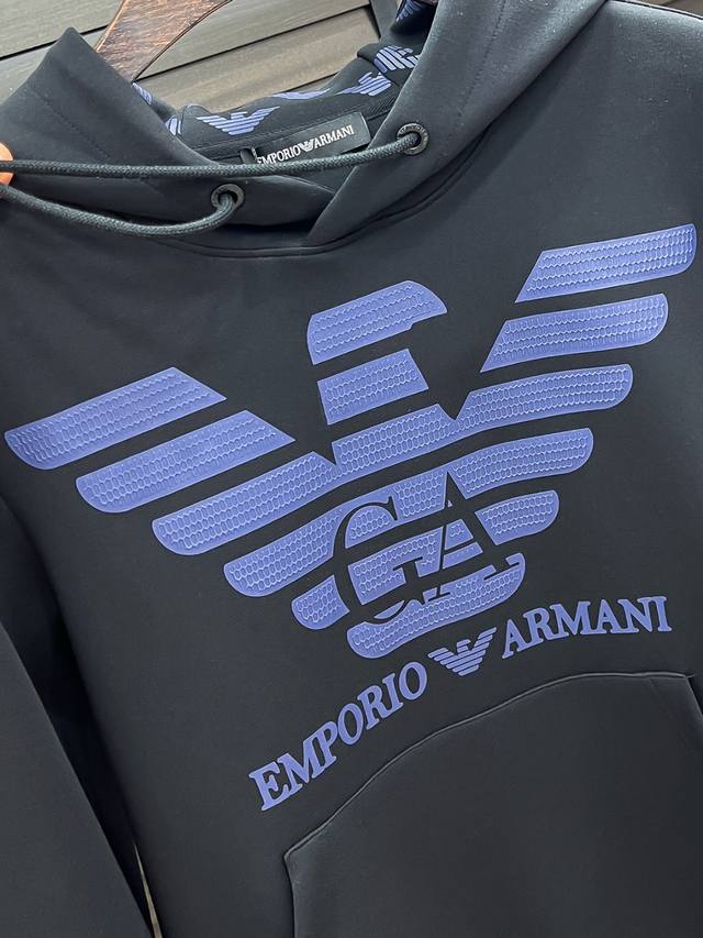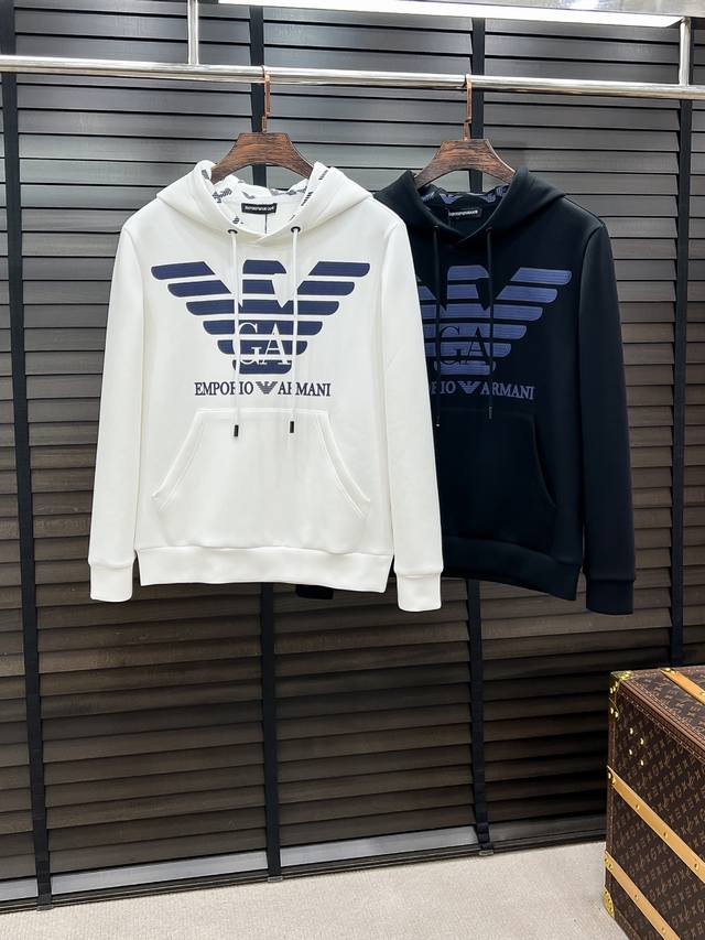 E Armani #25 Autumn/Winter Air Layer Hooded Sweatshirt DDD Unisex Fashionable Casual Sweatshirt! Rarely available from trading company channels, ahead of official website release! Always a unique and highly recognizable brand , Armani consistently creates stylish pieces with a minimalist style. It's suitable for all ages and genders, easy for anyone to wear! The basic casual crew neck cut is slimming and flattering, suitable for various casual outfits. It's unisex and highly recommended! DDD This sweatshirt is made from imported air layer knitted cotton fabric, which is lightweight, delicate, and soft to the touch, while maintaining excellent crispness. The inner lining features a tightly arranged terry loop texture, providing warmth and breathability without any prickly feeling. The cuffs and hem feature matching dyed knitted ribbed trim, making the wearer even more stylish and handsome! The front of the garment is decorated with a pattern, meticulously printed using top-tier craftsmanship and adorned with brand embellishments, showcasing both luxury and style! Colors: Black, White Sizes: S, M, L, XL