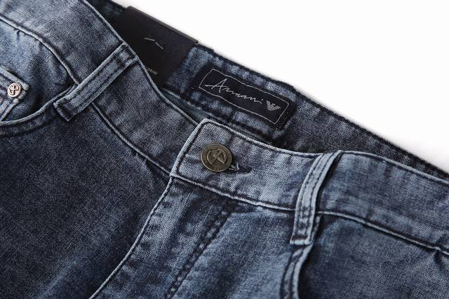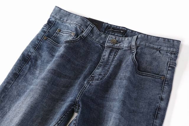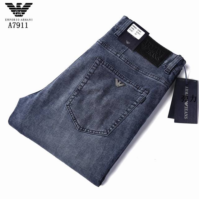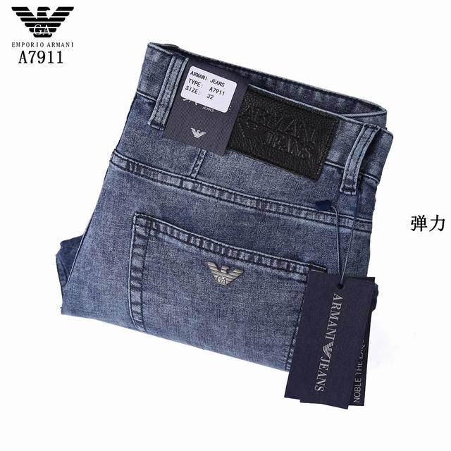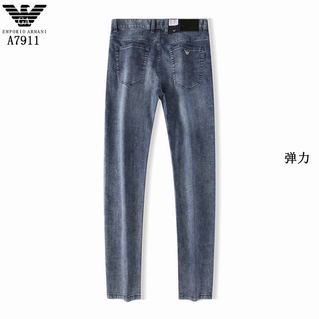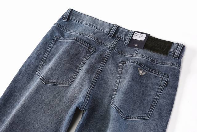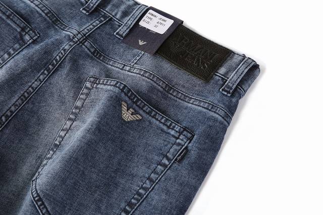 Style No. A7911 Armani's summer light blue collection is now available. Made from a thin, high-elastic cotton fabric, these trousers are soft, comfortable, and breathable. The salt-washing process minimizes skin irritation by allowing the dyes in the fabric to react chemically. A-grade electroplated hardware adds a finishing touch to the light blue trousers. The genuine leather label paired with the light blue color ensures a cool and refreshing feel in the hot summer. Sizes 29-42.