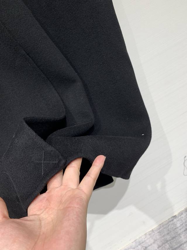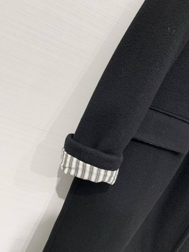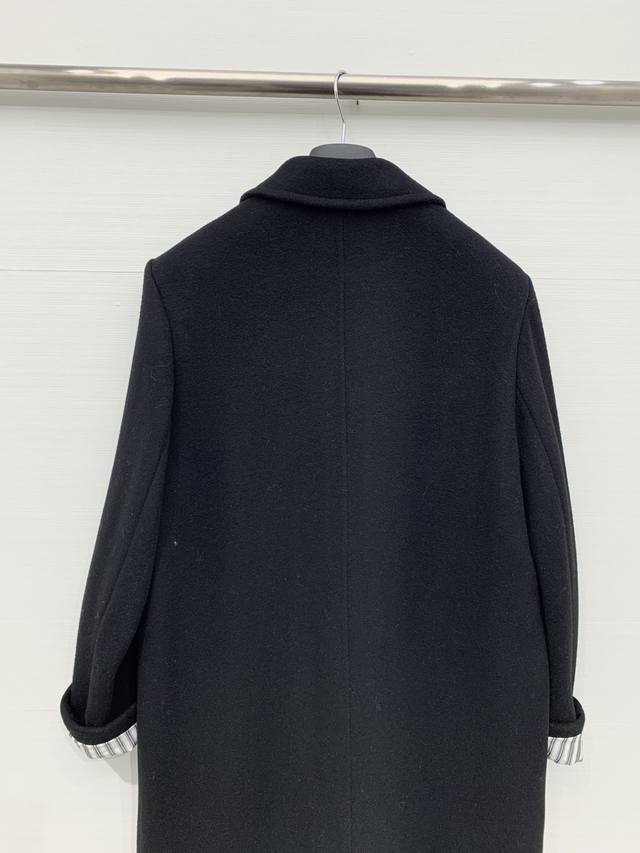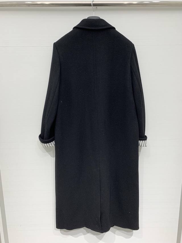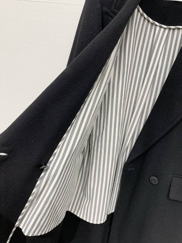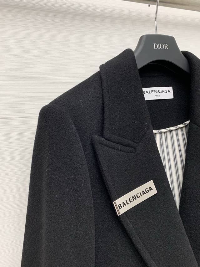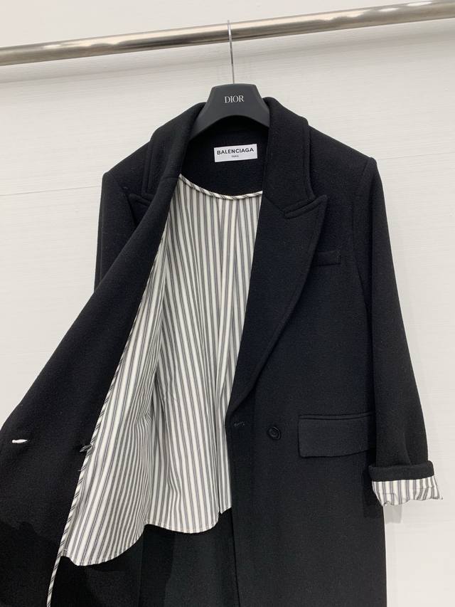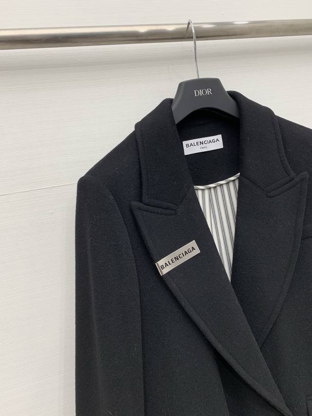 Balenciaga Fall/Winter 2025 New Black Long Suit Wool Coat. Features a classic suit lapel, single-breasted closure, and large patch pockets on both sides. The overall silhouette is a slim-fitting yet relaxed long style, a minimalist and sophisticated dark-toned workwear piece. A "Balenciaga" metal logo embellishment adorns one side of the collar. The half-lined design with a gray and black pinstriped lining creates a subtle color-blocking effect, retaining the sharp lines of a suit while offering the warmth of a coat. Sizes: S, M, D, D