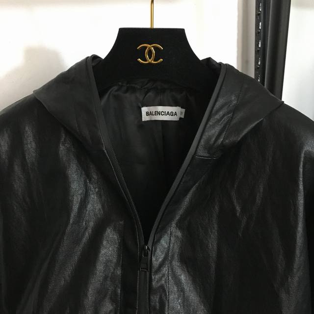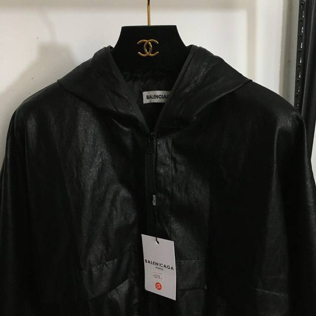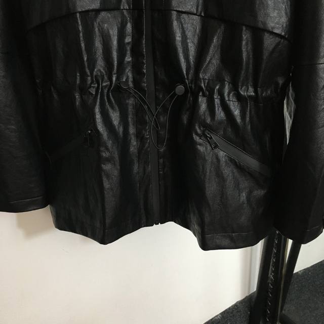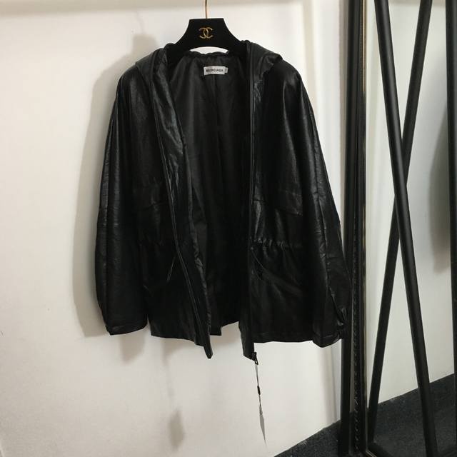Style No. 7684 Balenciag* new waist drawstring long-sleeved hooded PU leather j