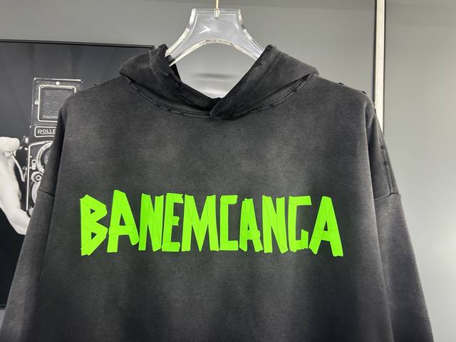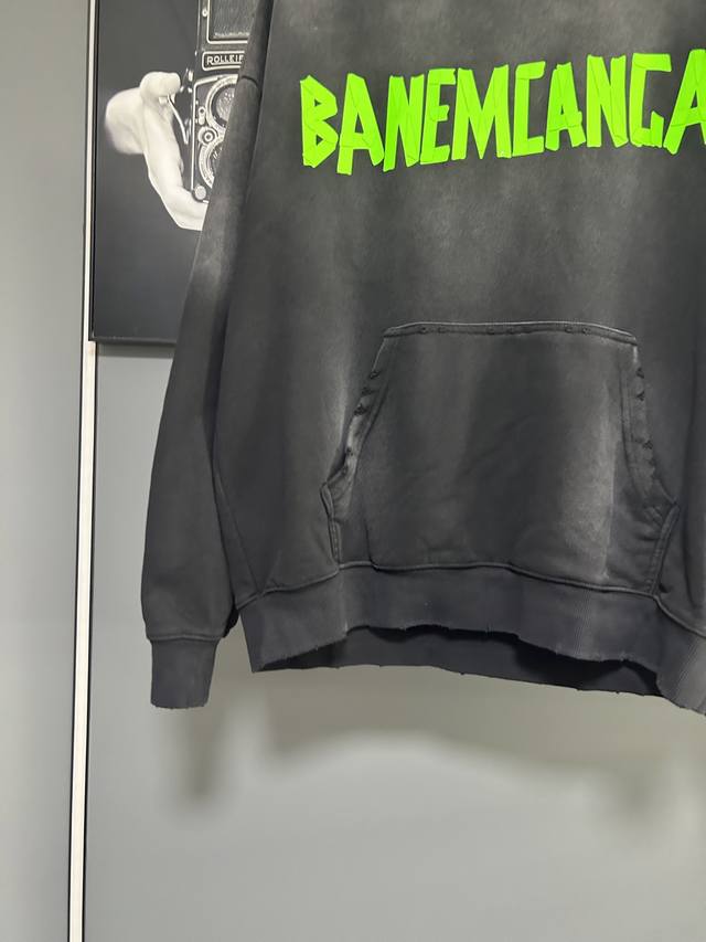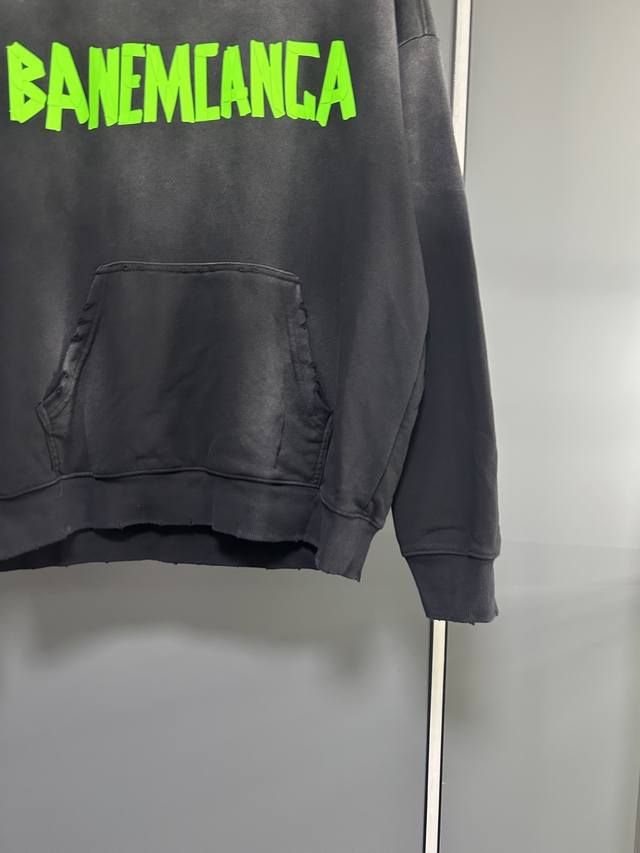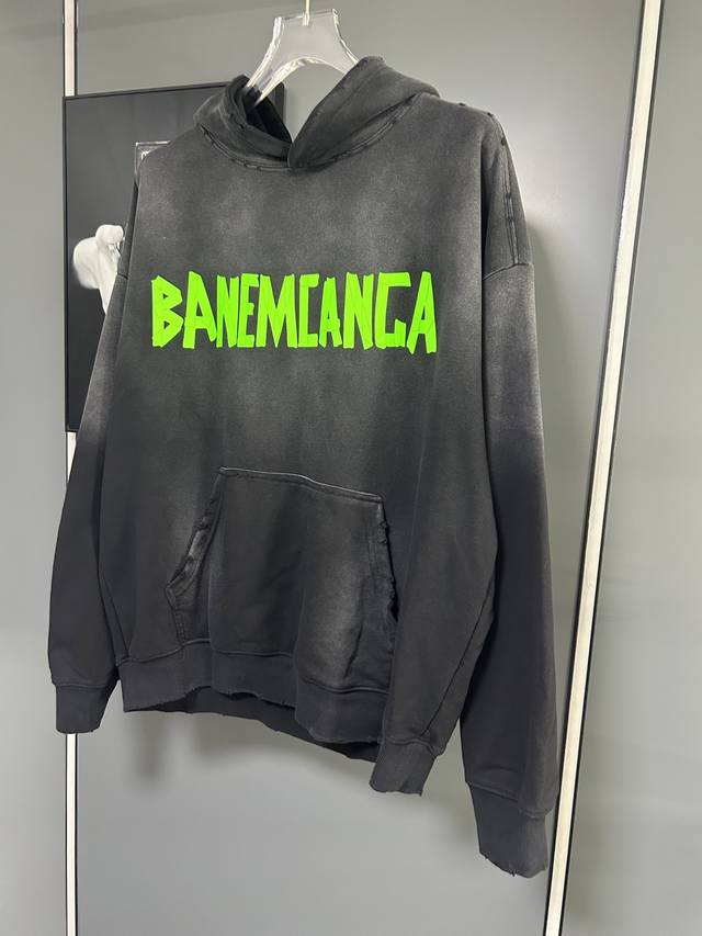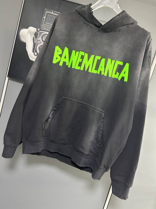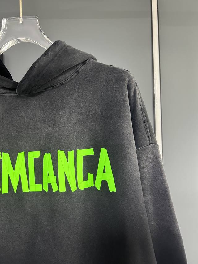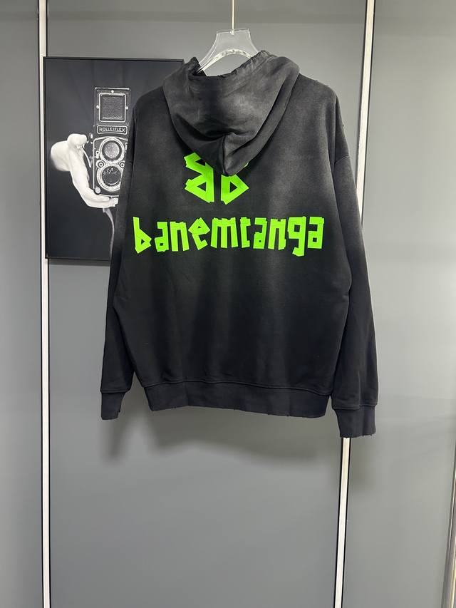 2025 Autumn/Winter Balenciaga washed and distressed green 3D offset printed logo hooded sweatshirt Non-market printed bottom version distressed and worn unisex style