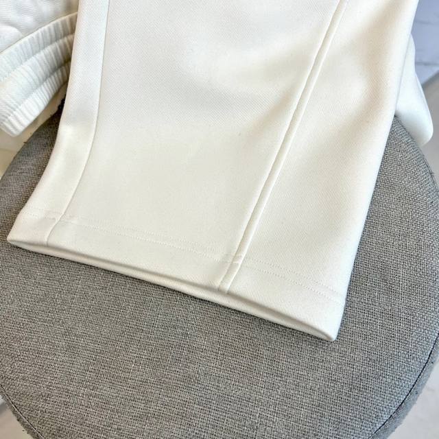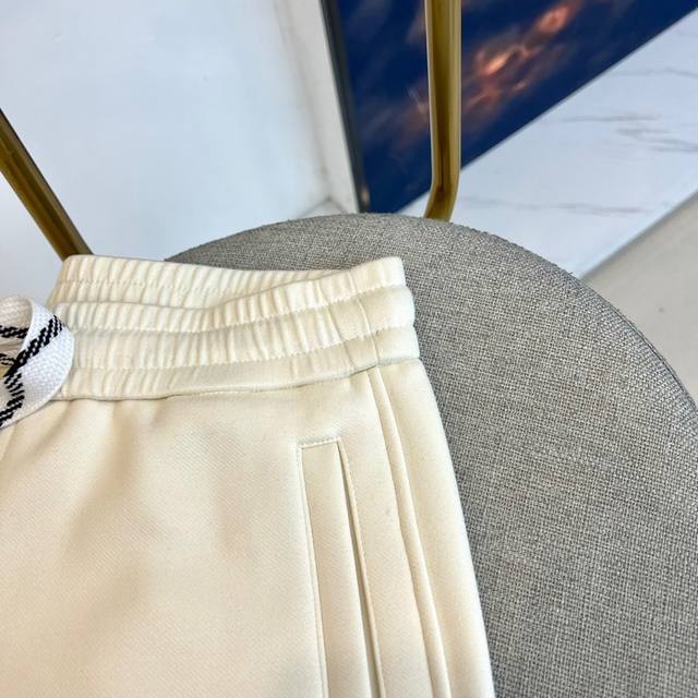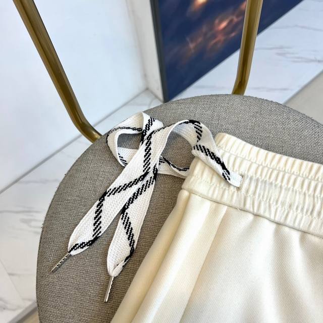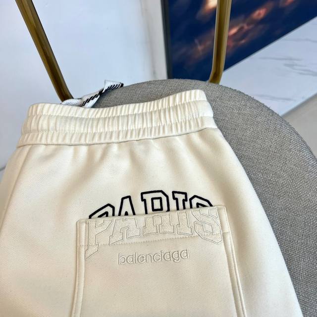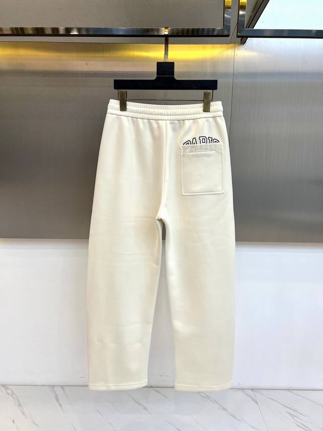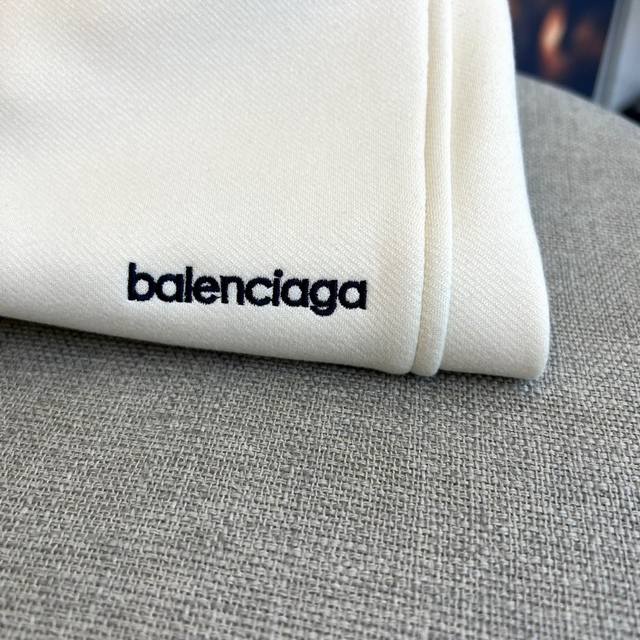 Balenciaga's new men's casual scimitar pants for Fall/Winter 2025. These casual pants feature the signature scimitar silhouette, with a three-dimensional cut that extends naturally from the knee to create a smooth, curved silhouette. The high-rise elastic waistband features a black and white diamond-patterned drawstring, and slant pockets on each side maintain a clean silhouette. The brand logo is embellished on the lower right leg. The fabric features an innovative two-layer construction: a 91.9% polyester and 8.1% spandex top layer for structure, while a base layer of 89.5% polyester and 10.5% spandex enhances stretch. The tapered leg tapers naturally at the ankle. The groundbreaking scimitar cut redefines the casual pants silhouette, perfect for pairing with sneakers for a street-chic vibe or boots for a high-fashion look. The off-white hue easily complements any top, perfectly balancing comfort with a cutting-edge design, reflecting Balenciaga's philosophy of integrating architectural aesthetics into everyday wear. Model 48-56, 173cm tall, 143kg, wearing a size 50