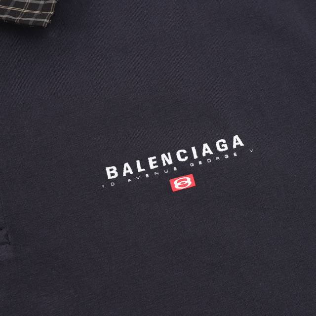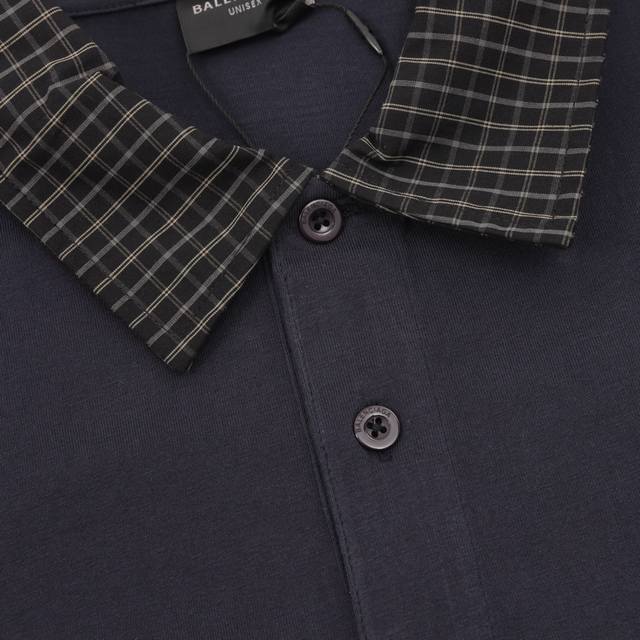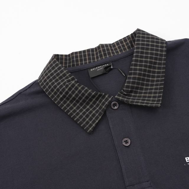 Balenciag New plaid collar splicing Polo T-shirt. Parisian deconstruction puzzle futurist's new college declaration. When the British plaid meets the capsule silhouette, this Polo shirt becomes a space-time rift in Demna's hands. Pure cotton lays the future base with a dark blue texture, while the torn Scottish plaid collar weaves the retro gene with cold lines. The two warps and wefts complete the quantum entanglement at the sharp boundary of laser cutting. The invisible shoulder line design makes the box-shaped tailoring float above the body, and the two logo resin buttons are inlaid on the chest like meteorite fragments. The collision of woven and knitted reveals the playful trump card of high-end fashion. The designer uses pixel-level dislocated plaid puzzles to deconstruct the elite narrative of the golf club and recast the century-old college symbol into an encrypted totem of street dark aesthetics. Wearing it on interprets high-end, the ultimate annotation of fashion and high-end. It is the same style for men and women, and it looks very good on the body. It is highly recommended.