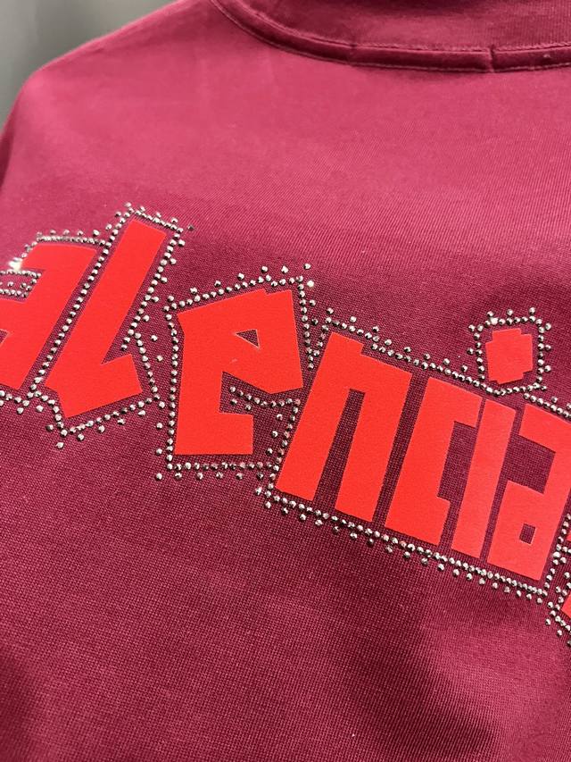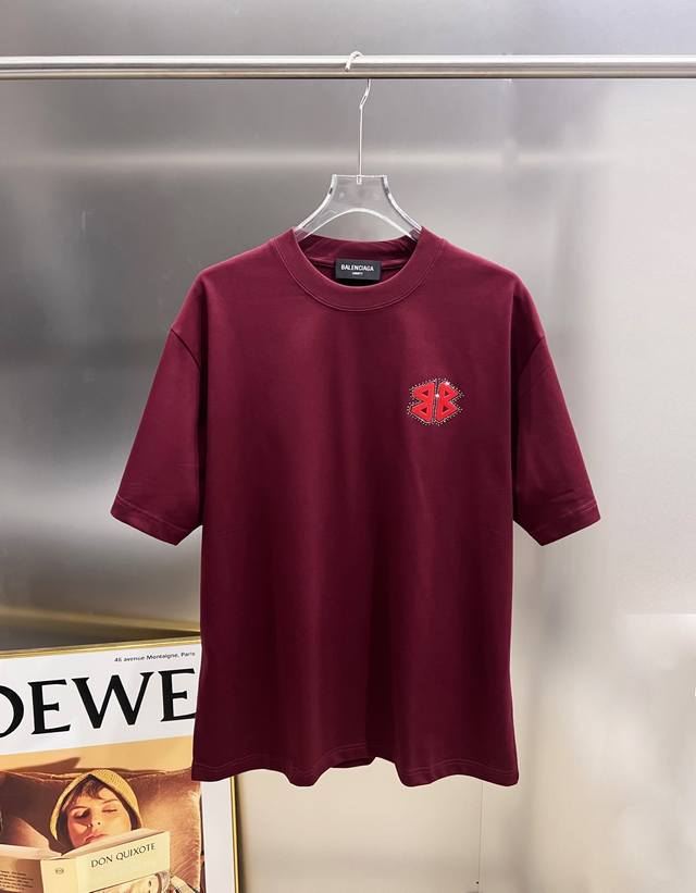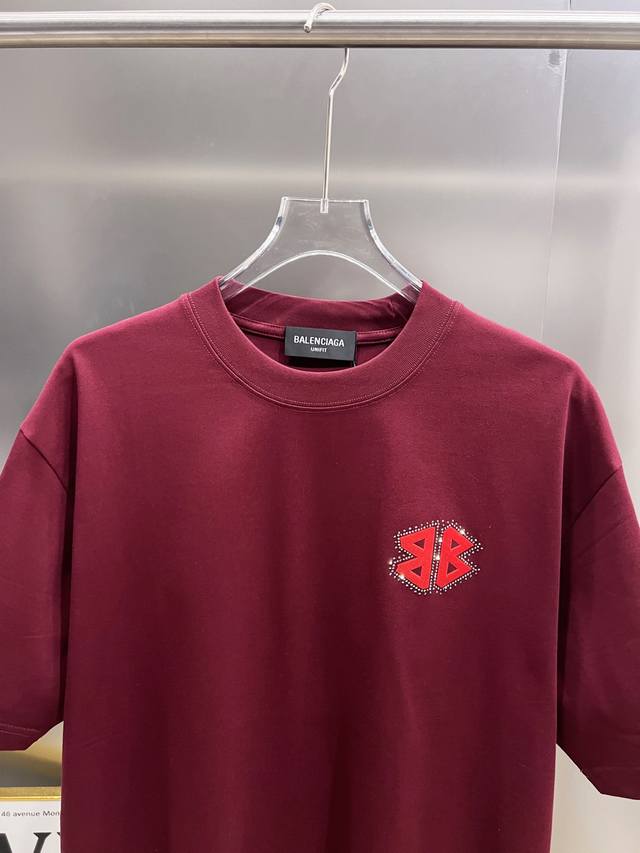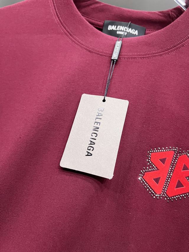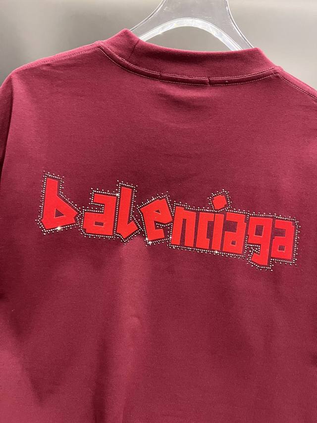 Balenciaga 2025 Autumn/Winter New Short-Sleeve T-Shirt, Classic Logo Print + Hot Stamping Rhinestones, Unisex, Loose Fit, Sizes S, M, L, XL, XL. Colors: Black, White, Angolan Red.