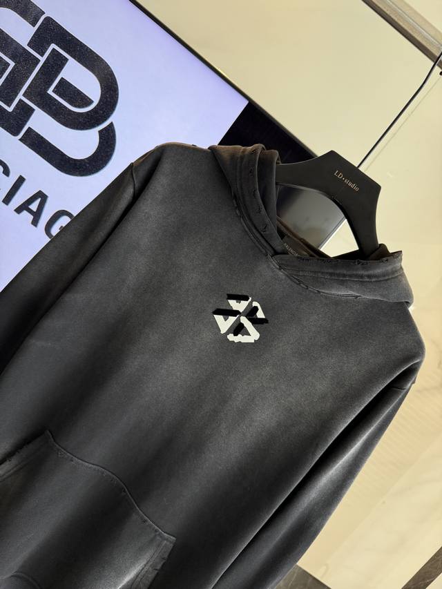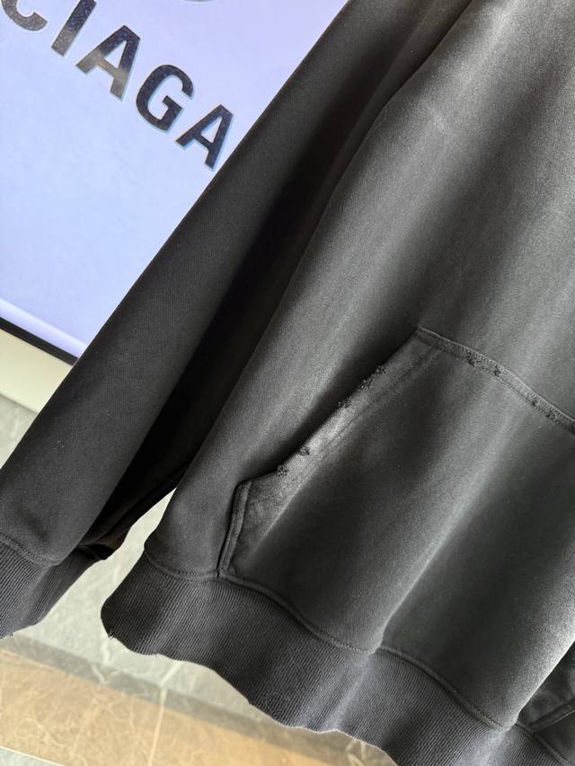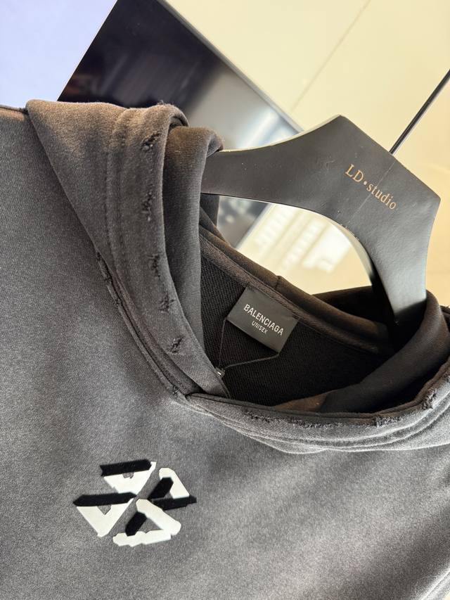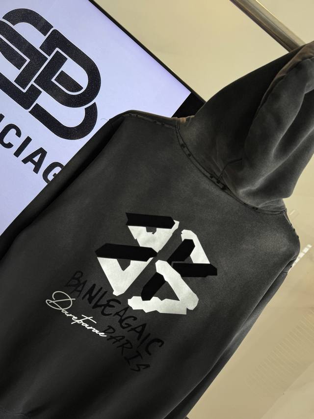 Balenciaga 2025 Fw Double B Letter Flocked Print Washed Distressed Hooded Sweatshirt