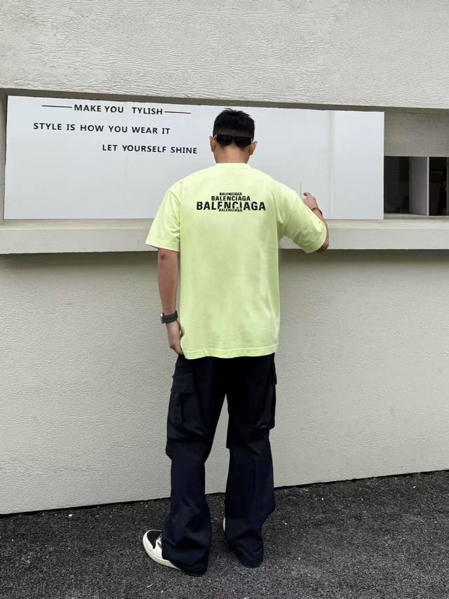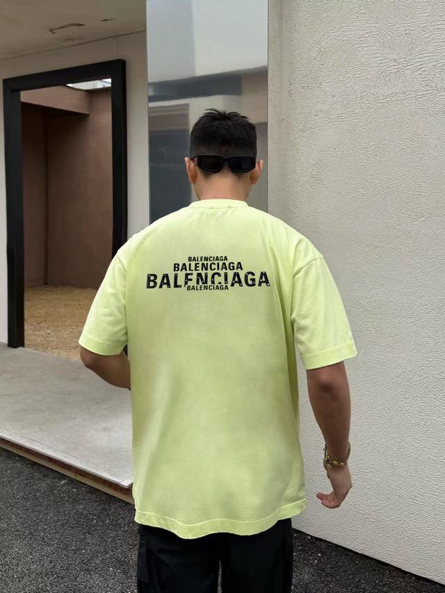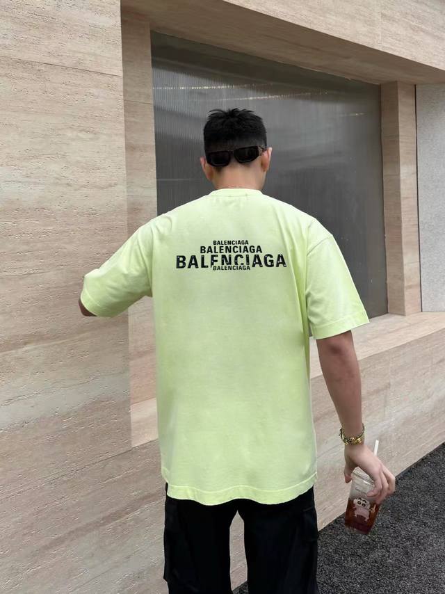Balenciaga 2025Ss new spring and summer short-sleeved cotton plain fabric, re-washing and shaping, worn-out process, chest logo, 3D three-dimensional glue pressing process, high-quality, soft feel, customized fabric, fine workmanship, unisex style, black, white, fluorescent green, SML Xl Xxl