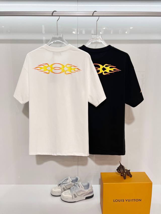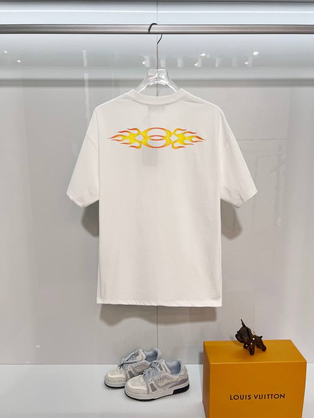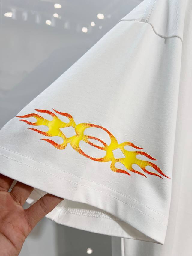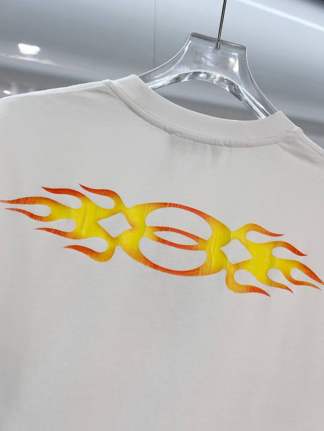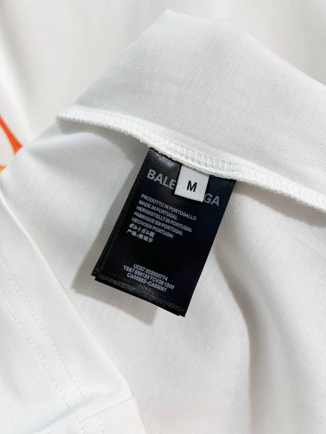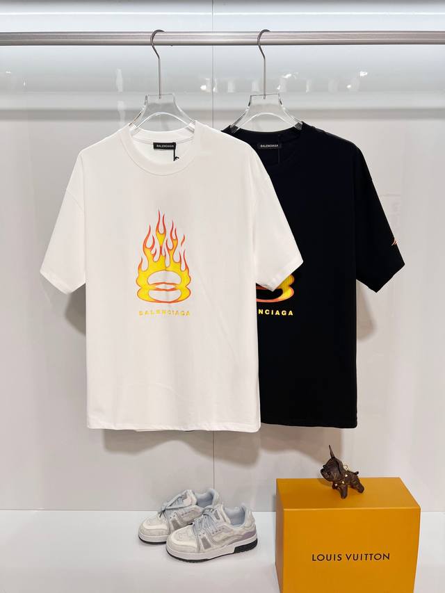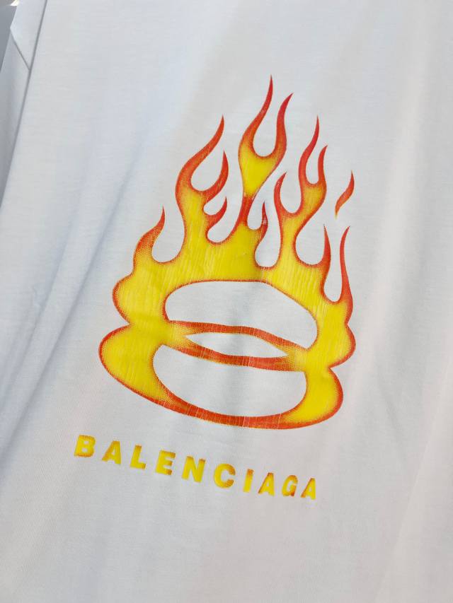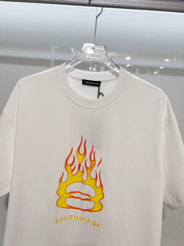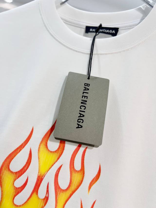 Balenciaga 2026 New Style Cracked Flame Pattern Logo T-Shirt for Men and Women. Custom 320g 100% Double Yarn Cotton Fabric. 32-count Double Ribbed Finish. Includes neck label, hangtag, and main label. Color: White. Sizes: S, M, L, XL.