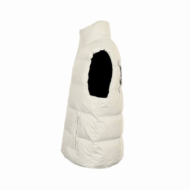 ) Made of nylon fabric, this down vest offers excellent wind and water resistance and is relatively lightweight. Combined with down filling, it's both lightweight and warm, easy to carry and wear, making it especially suitable for outdoor activities. It's filled with high-quality 90% white duck down, known for its high loft and superior warmth. The unique cut and design emphasize ergonomics, ensuring a comfortable fit and freedom of movement. The back features an imported Meclo embroidery machine that scans the original pattern before creating a pattern with high-quality thread, continuously adjusting the density to achieve the desired effect. (