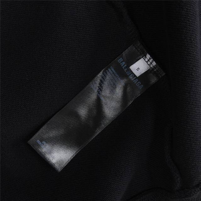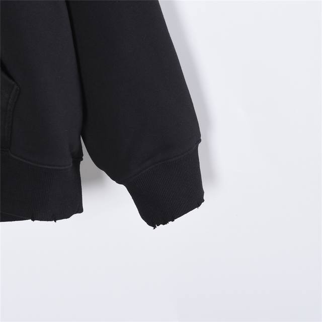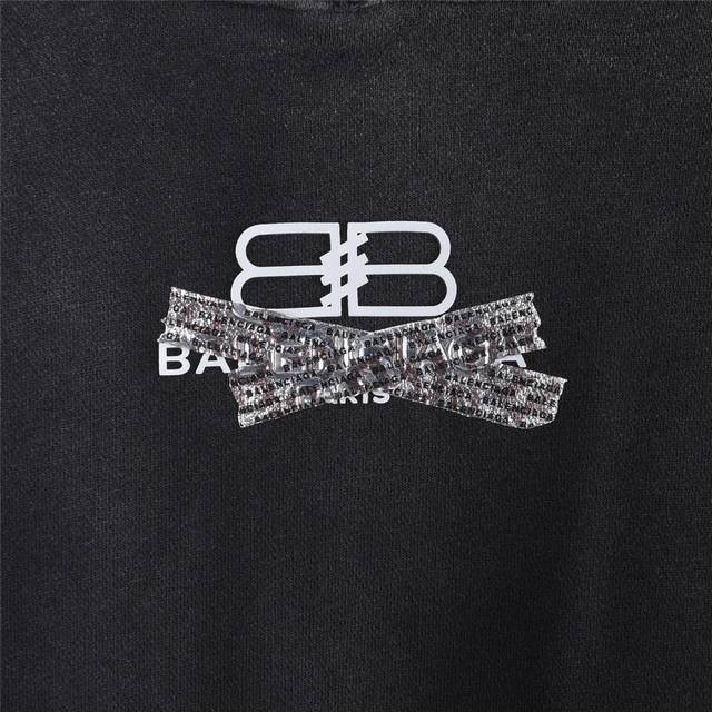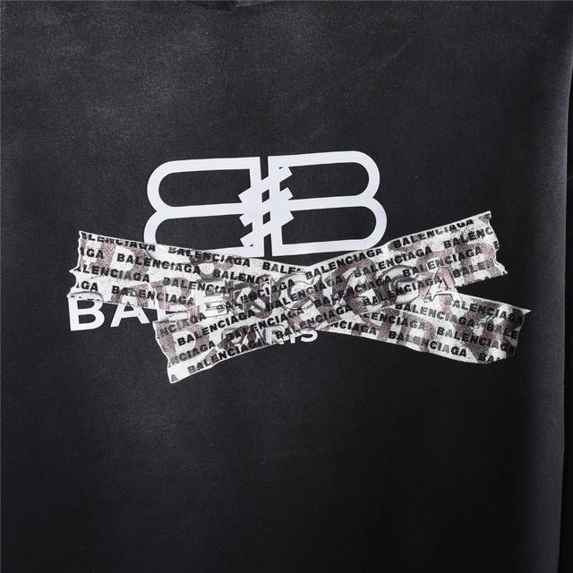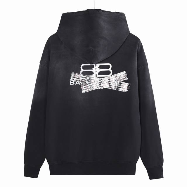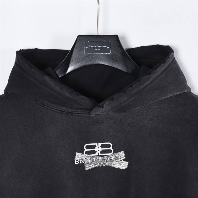 Balenciaga 25Fw 3D Double B Tape Lettering Washed Ripped Hooded Sweatshirt. Made with a heavyweight (G) weight, using imported direct-to-garment technology to transform color blocks into continuous tones, improving color purity and stability. The pattern is clear with strong lines and a three-dimensional feel. Features 3D double B tape lettering on the chest and back. Stone-washed ripped details. The distressed details are achieved using a stone-washing machine with laser positioning for hand-distressed wear effects. Each distressed area is handcrafted to achieve a harmonious visual effect of natural fabric wear. The fabric is then dyed through a soft wash, continuously immersing and tumbling in the dye to alter the original color, creating a vintage look with a subtle, aged effect. Color: Washed Black. Size: S-XL.