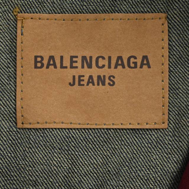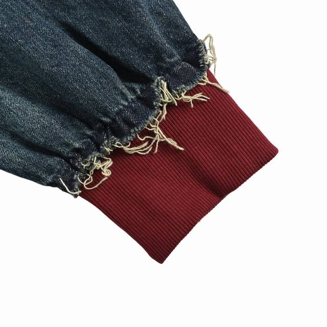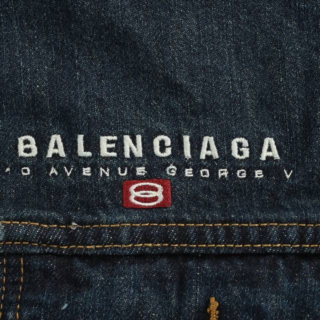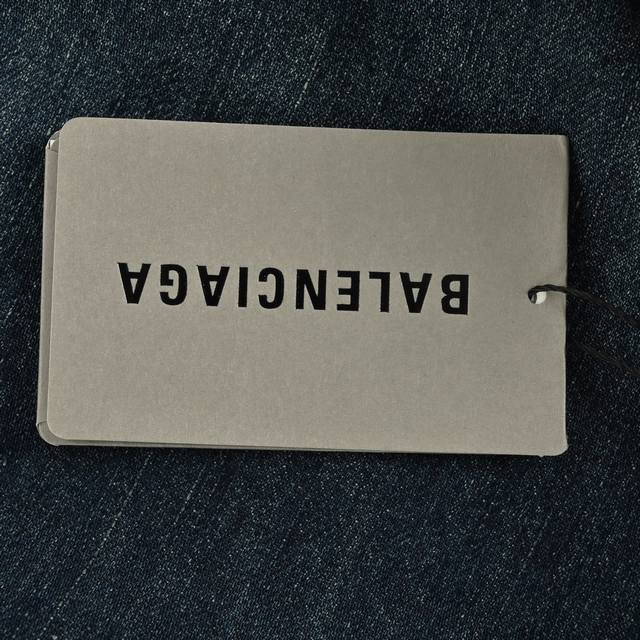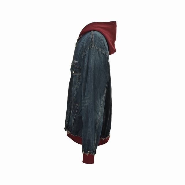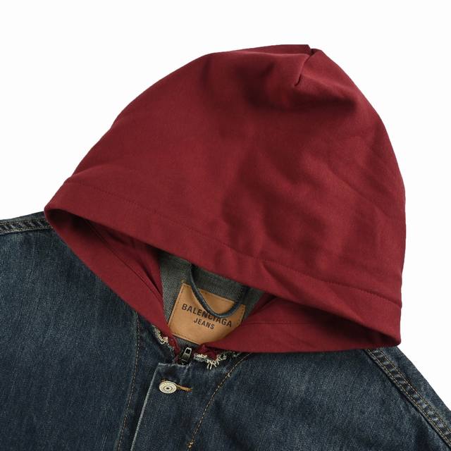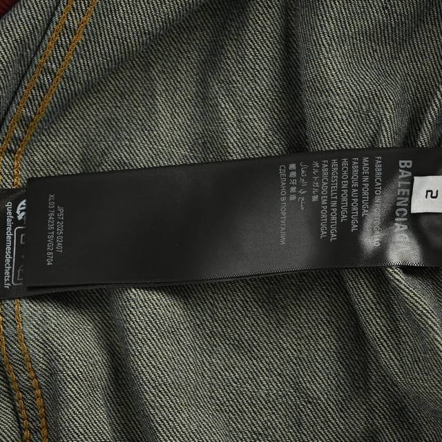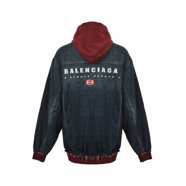 Balenciaga 25Fw Embroidered Letter Faux Two-Piece Hooded Denim Jacket. Made with custom denim fabric using imported machine embroidery. The distressed details are achieved using a frayed edge technique to create a worn and distressed effect. Multiple monkey-sanding techniques are employed, with textures created using a high-pressure spray gun. The process is extremely complex, time-consuming, and labor-intensive, utilizing electrolytic deep blue stone washing to achieve the aged effect. Size: 1-4.