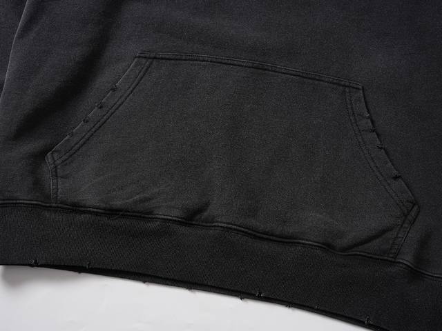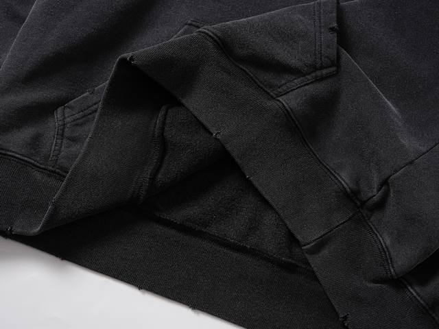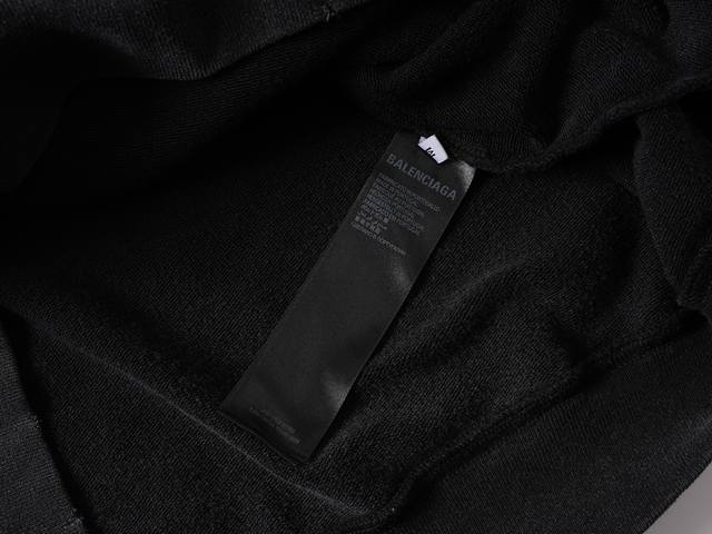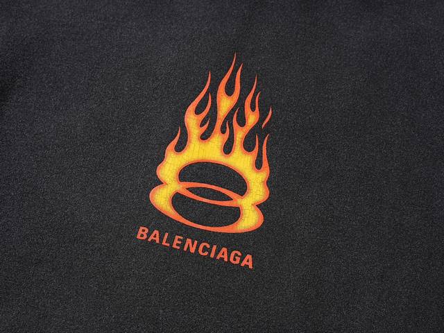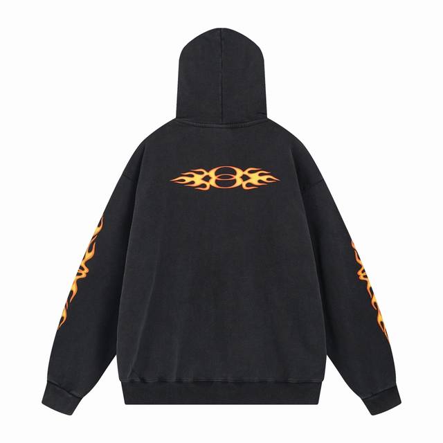 Balenciaga 25Fw Flame Direct Injection Distressed Hooded Sweatshirt (New Arrival). First-hand authentic product, far superior to market stock. Highly recommended for comparison! Fabric is made of Paris Zp custom-woven and dyed 100% cotton. Weight: weight missing] grams, clean fabric surface, clear weave, soft and comfortable. Ribbing uses custom dyeing with no color difference. Print uses environmentally friendly imported materials for direct injection, resulting in clear patterns and colors with a three-dimensional effect. The entire garment is washed and distressed. Fit is a relaxed, drop-shoulder style. Unisex. Color: Washed Black. Sizes: Xs, S, M, L.